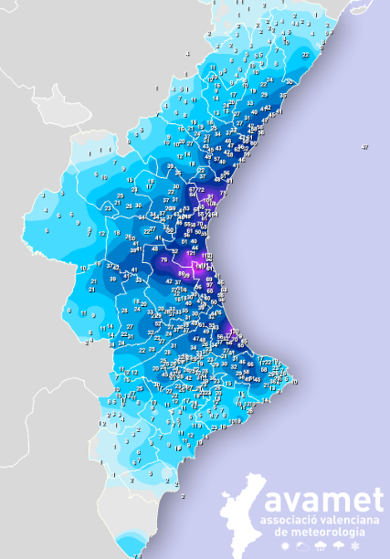 El màxim de precipitació s’ha concentrat a la comarca del Comtat, sent Benimassot on s'ha viscut una jornada molt intensa, amb 161,4 mm, convertint-se en un dels municipis on més ha plogut.