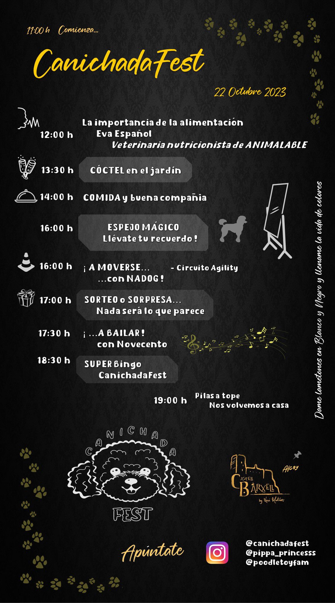 Tot començarà a les 11 h del diumenge 22 d’octubre on hi haurà activitats de tot tipus, com xerrades, circuits d’Agility, bingo i activitats de ball, tot acompanyat de menjar de qualitat com ens té acostumats Castell de Barxell. També hi haurà una mena de fira i sortejos de marques reconegudes en el món dels gossos.