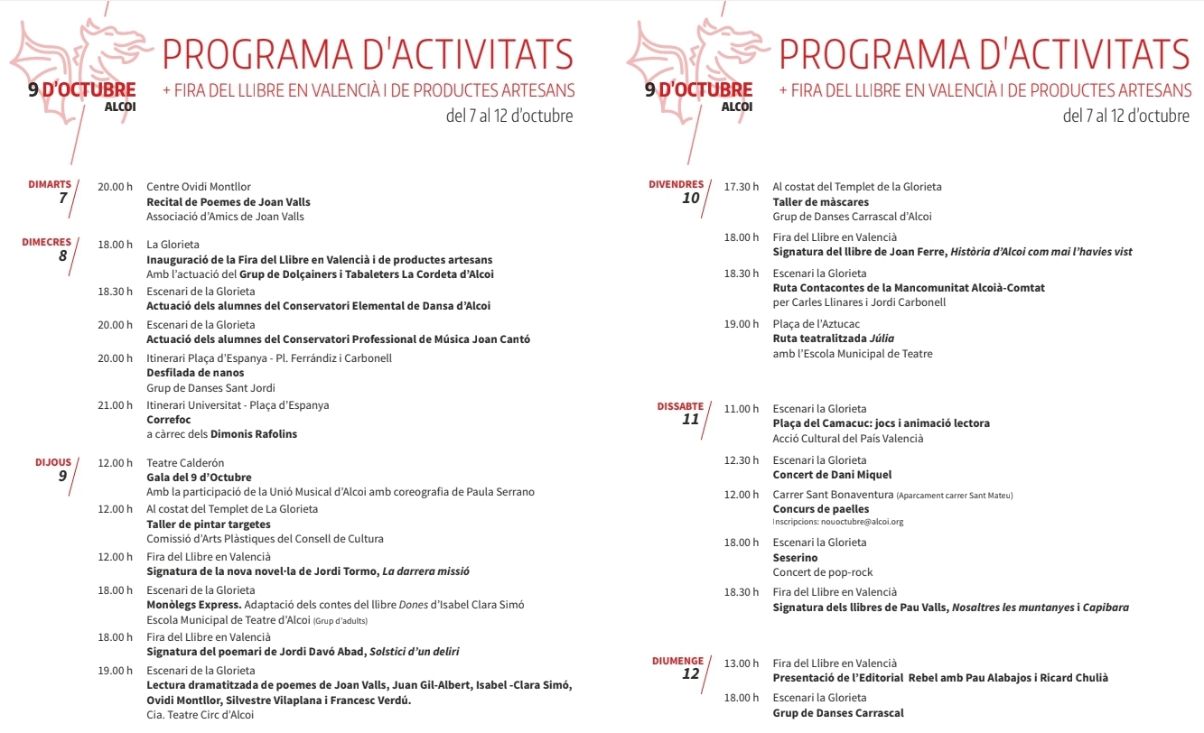 Alcoi celebrarà la festivitat del 9 d'octubre des de dimarts 7 fins al diumenge 12 amb una atapeïda i variada programació. La regidora de cultura Elisa Guillem agraeix l'activa participació d'associacions, llibreters i comerciants, "històricament ha sigut la societat civil qui l'ha mantingut viu. I gràcies a eixe moviment associacionista, el dia de hui tenim una programació brutal".