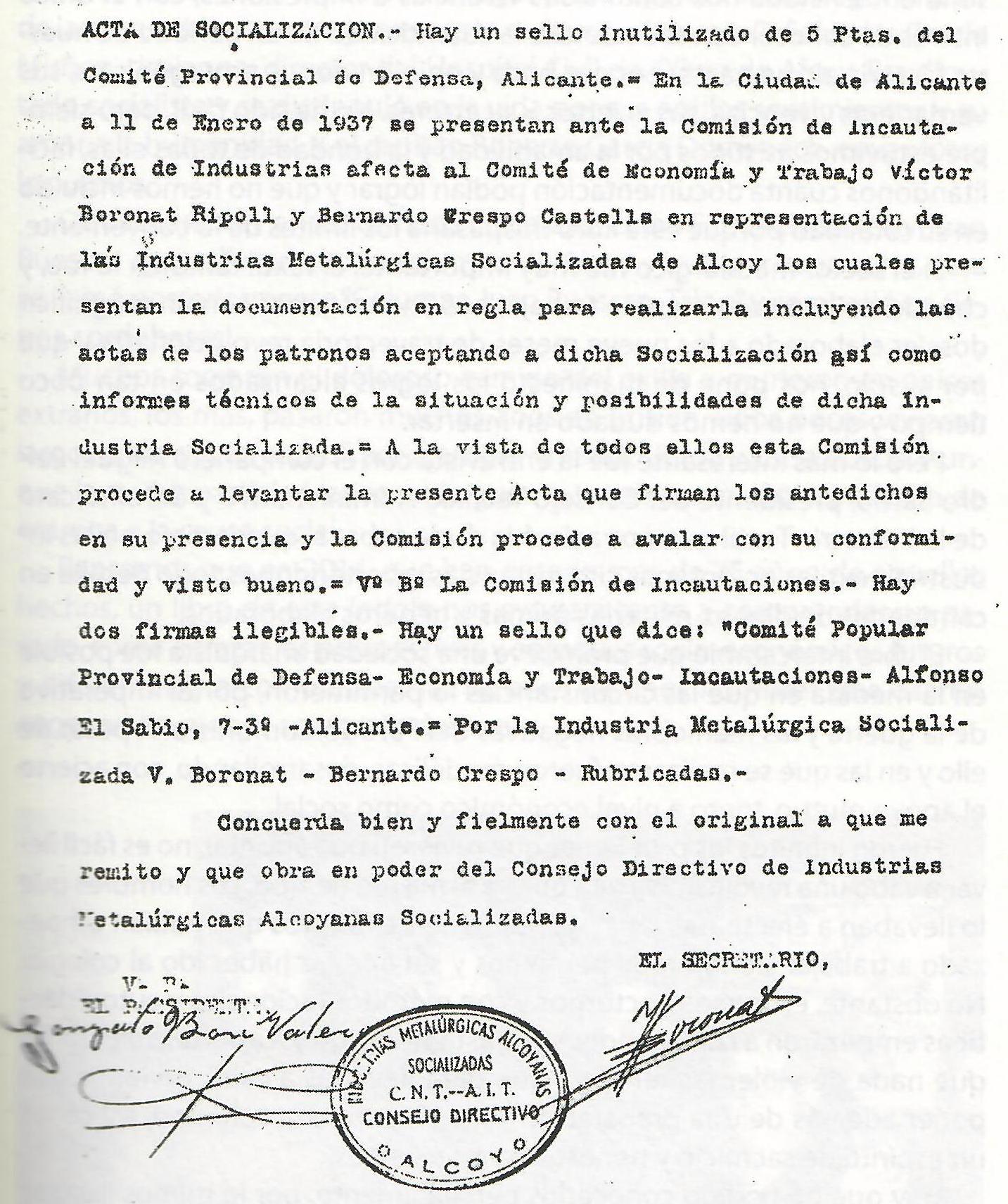 Comencem en un certificat que parla d’unes industries metal·lúrgiques socialitzades d’Alcoi. En aquest cas sembla que és un document fet en la seu provincial on els propietaris havien consentit voluntàriament la socialització.