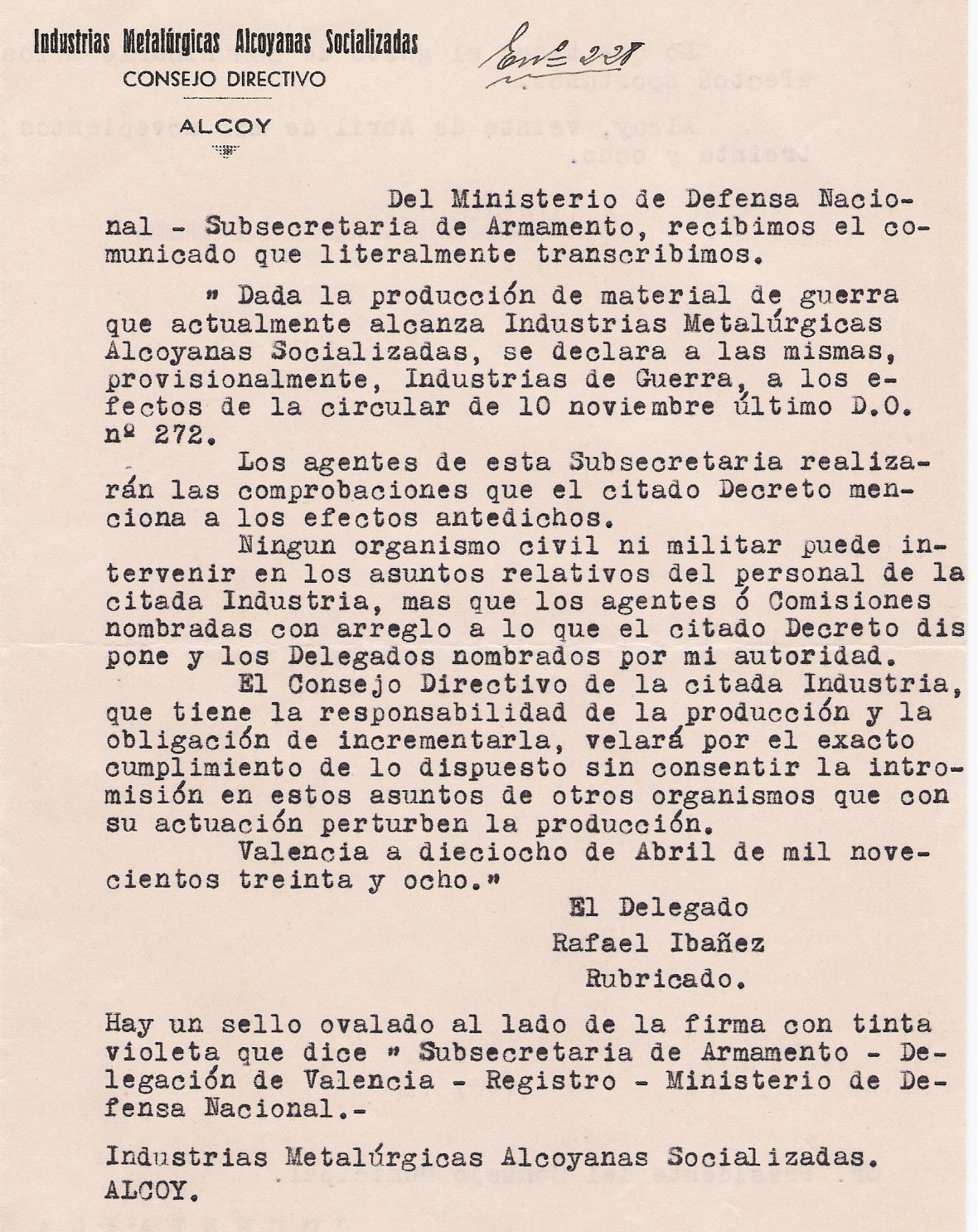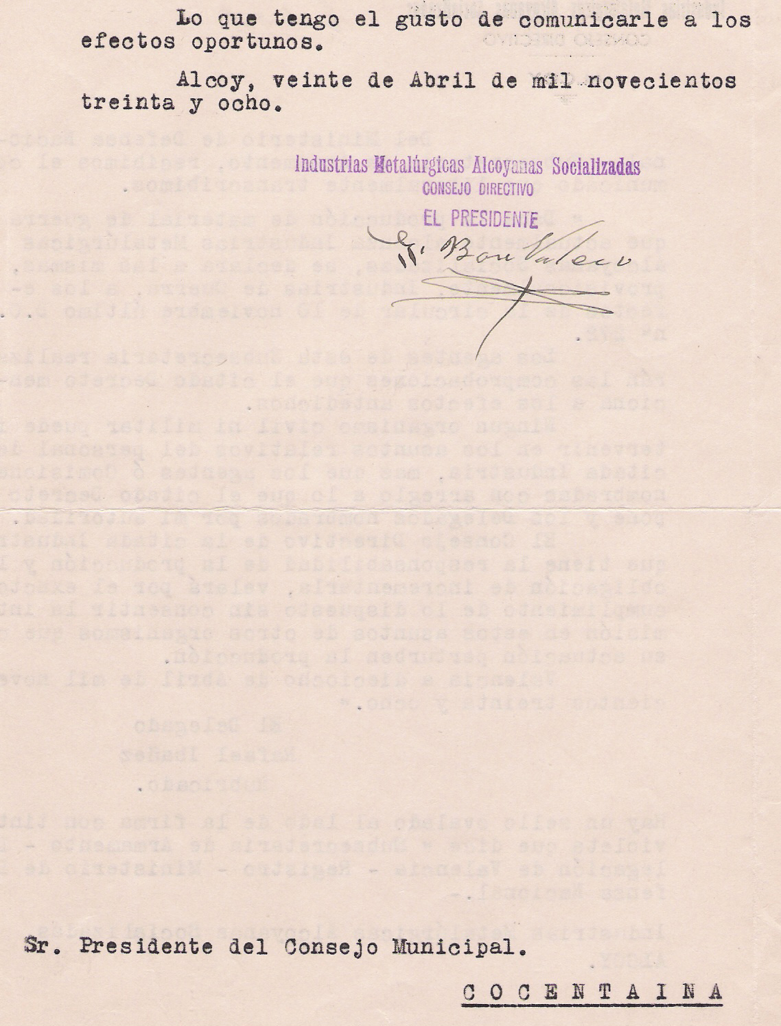 Un altre certificat de la mateixa empresa Metal·lúrgica Alcoiana és enviat a l’alcalde de Cocentaina advertint que era una empresa de Guerra (1ª i 2ª part) i per tan gaudia de totes les prerrogatives legals que concedia el govern. Aquest document m’ha causat estranyesa perquè a Cocentaina no conec que hi hagués cap metal·lúrgia que estigués dintre d’aquella d’Alcoi. El que rebera l’alcalde de Cocentaina aquest comunicat he deduït que podria tractar-se de diferents motius: o que algun xicotet taller familiar treballara per aquella empresa; o perquè hi havien homes de Cocentaina que treballaren a Alcoi i havien de desplaçar-se diàriament; o en últim cas (que podria ser el més probable) que es tractava de la fàbrica «La Marañosa», popularment dita «fabrica de bombes» situada a Cocentaina. Tot i així, aquesta fàbrica solament es dedicava a fer productes químics per a la guerra.