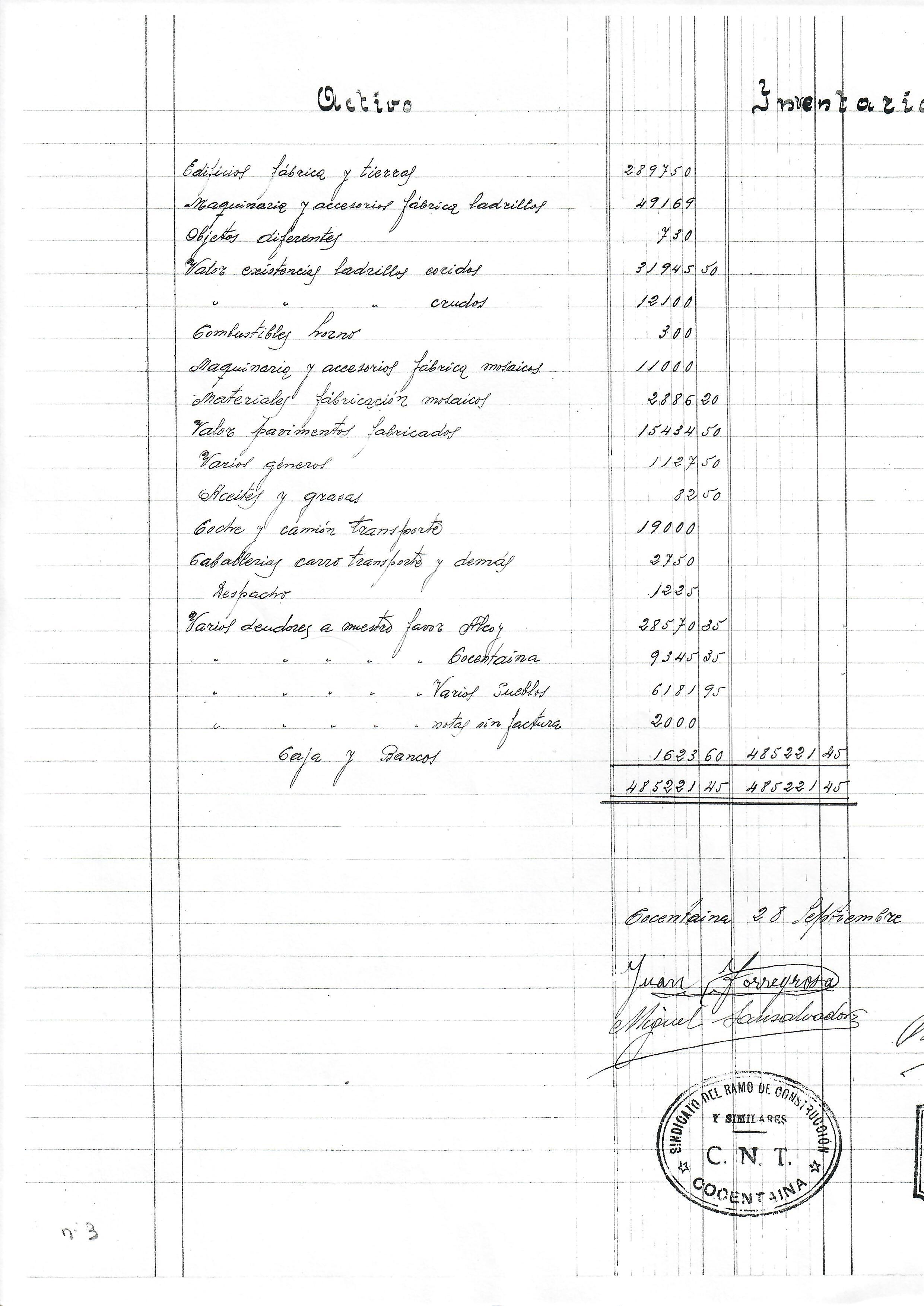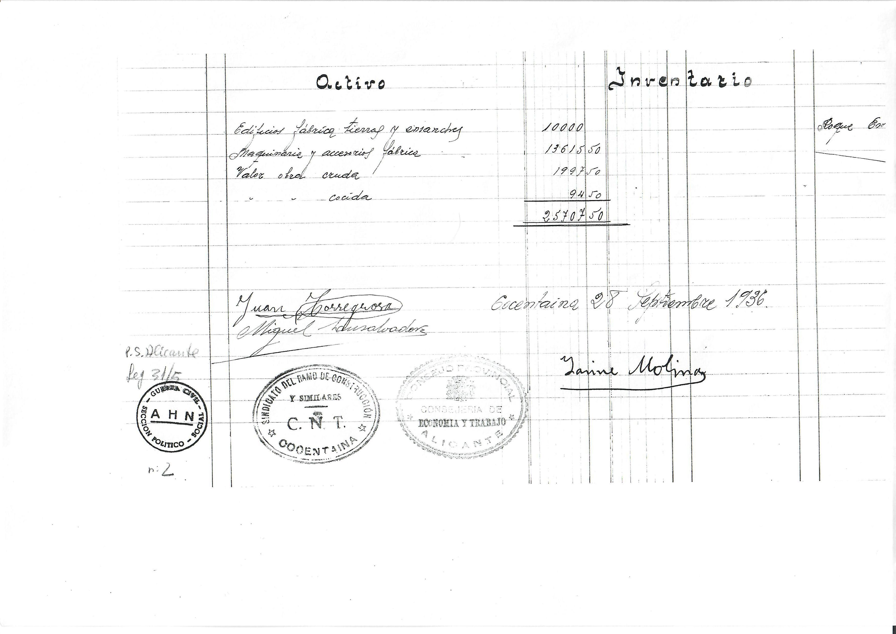 El primer que feren fou un inventari del seu valor, del que podem veure la del Teular d’Emilio Ferrandis (actiu i passiu). Com pot comprovar-se és un rigorós inventari signat per l’apoderat de l’Empresa i pels delegats sindicals. A Cocentaina hi hagué un acord entre la CNT i la UGT, on totes dues entitats portaren el control de la indústria.