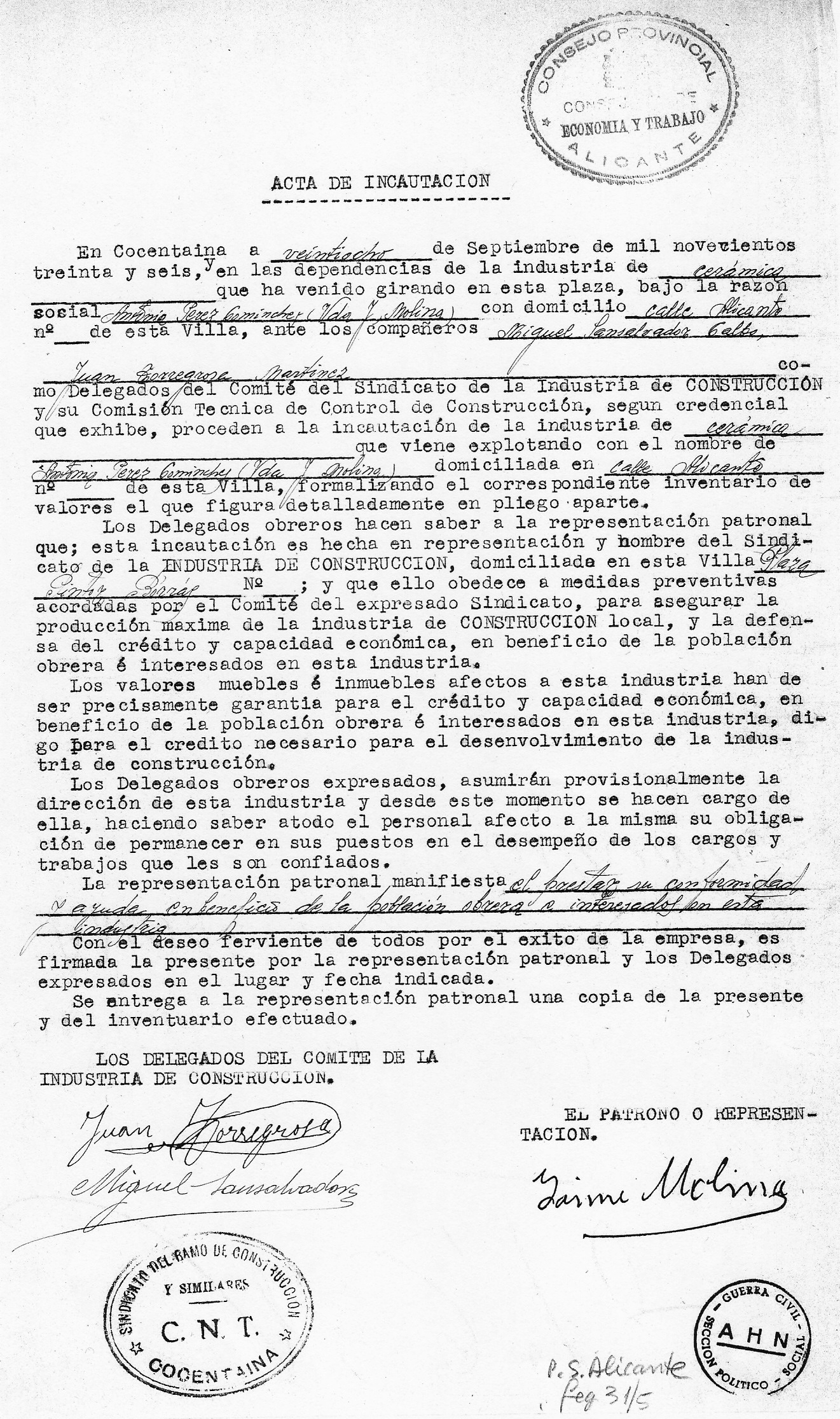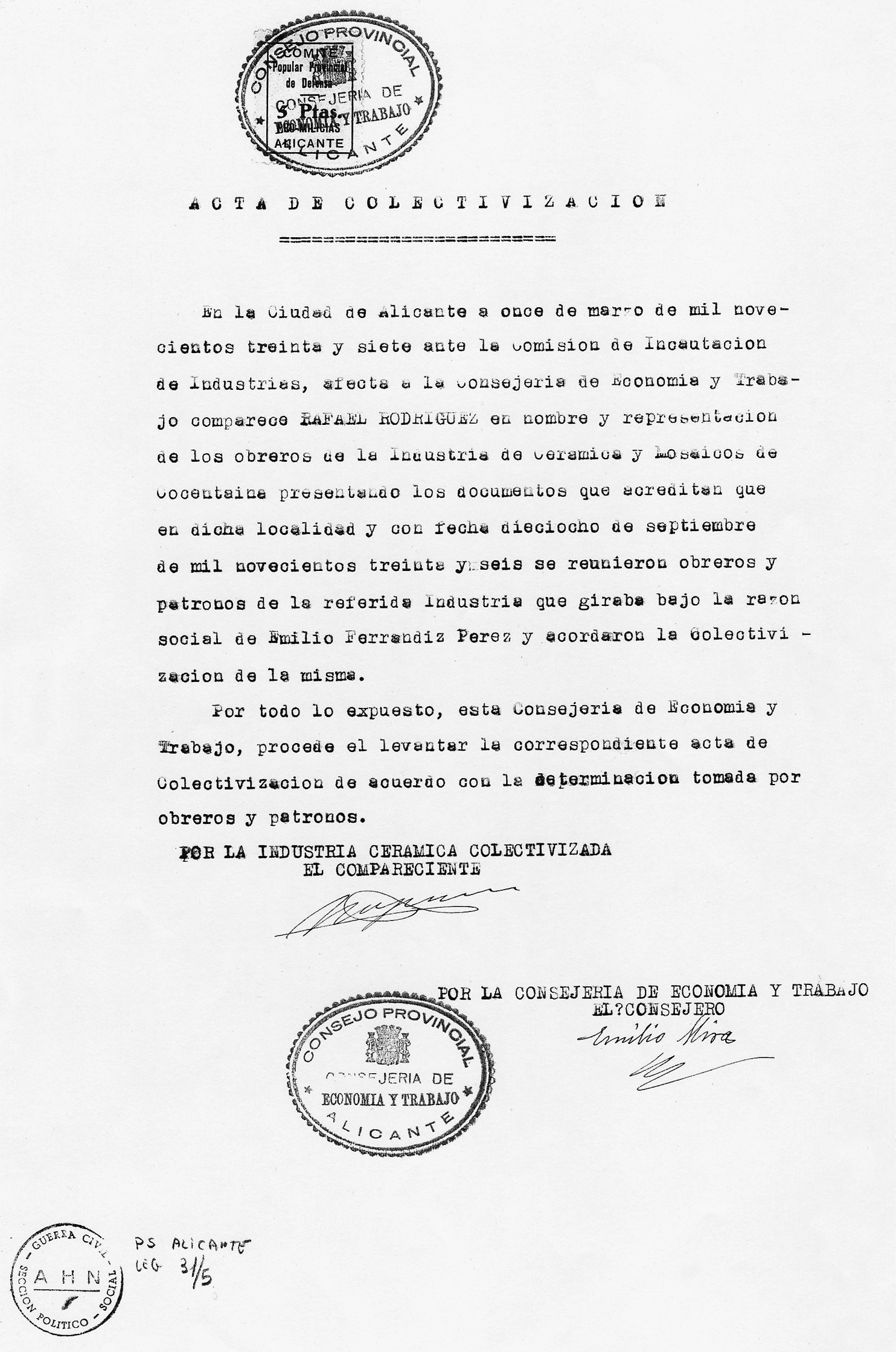 En la d’Emilio Ferrandiz va haver-hi una reunió el dia 18 de setembre de 1936 en la qual treballadors i empresari acordaren col·lectivitzar l’empresa. L’acta d’aquesta reunió no estava entre els papers de Salamanca que m’enviaren, però en queda constància per la referència que fa un altre document signat a Alacant.