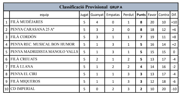 En el grup B, l'AC Samarita lidera en solitari la classificació. La pròxima partida serà este divendres 6 de febrer en la Filà Llana.