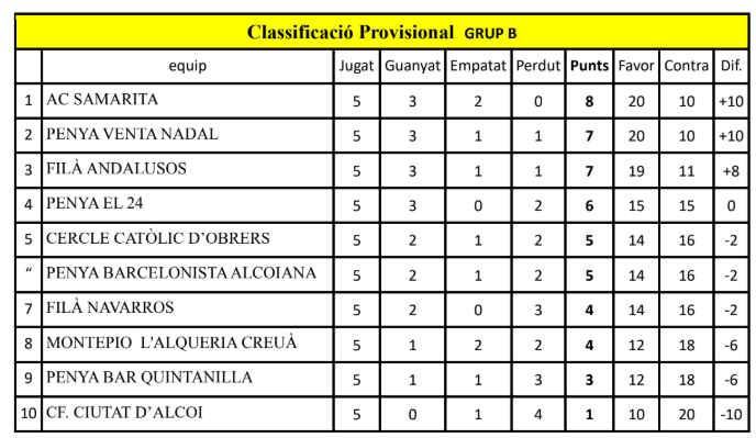 En el Grup B, s'ha viscut una derrota inesperada de la Filà Andalusos davant la Filà Navarros, i que ha possibilitat que l'AC Samarita puge a primera posició. No sense esforç perquè perdien 0-3 contra la Penya Bar Quintanilla i, contra tot pronòstic, aconseguiren remuntar fins a l'empat. La Penya Venta Nadal puja a la segona plaça després de desfer-se per 6-0 de la parella del Cercle Catòlic d'Obrers. Tanquen la classificació el CF Ciutat d'Alcoi amb el seu primer punt després d'empatar a 3 amb la Penya Barcelonista Alcoiana.