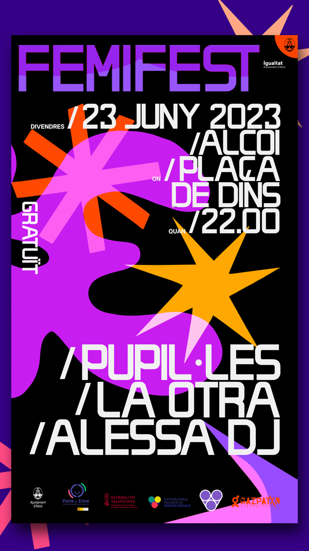 El “Femifest” omplirà la Plaça de Dins d’Alcoi el divendres 23 de juny a les 22 hores i “podrem gaudir del talent musical i artístic en clau feminista”, segons ens diu Álex Cerradelo (Compromís), recentment nomenat vicealcalde i regidor d’igualtat.