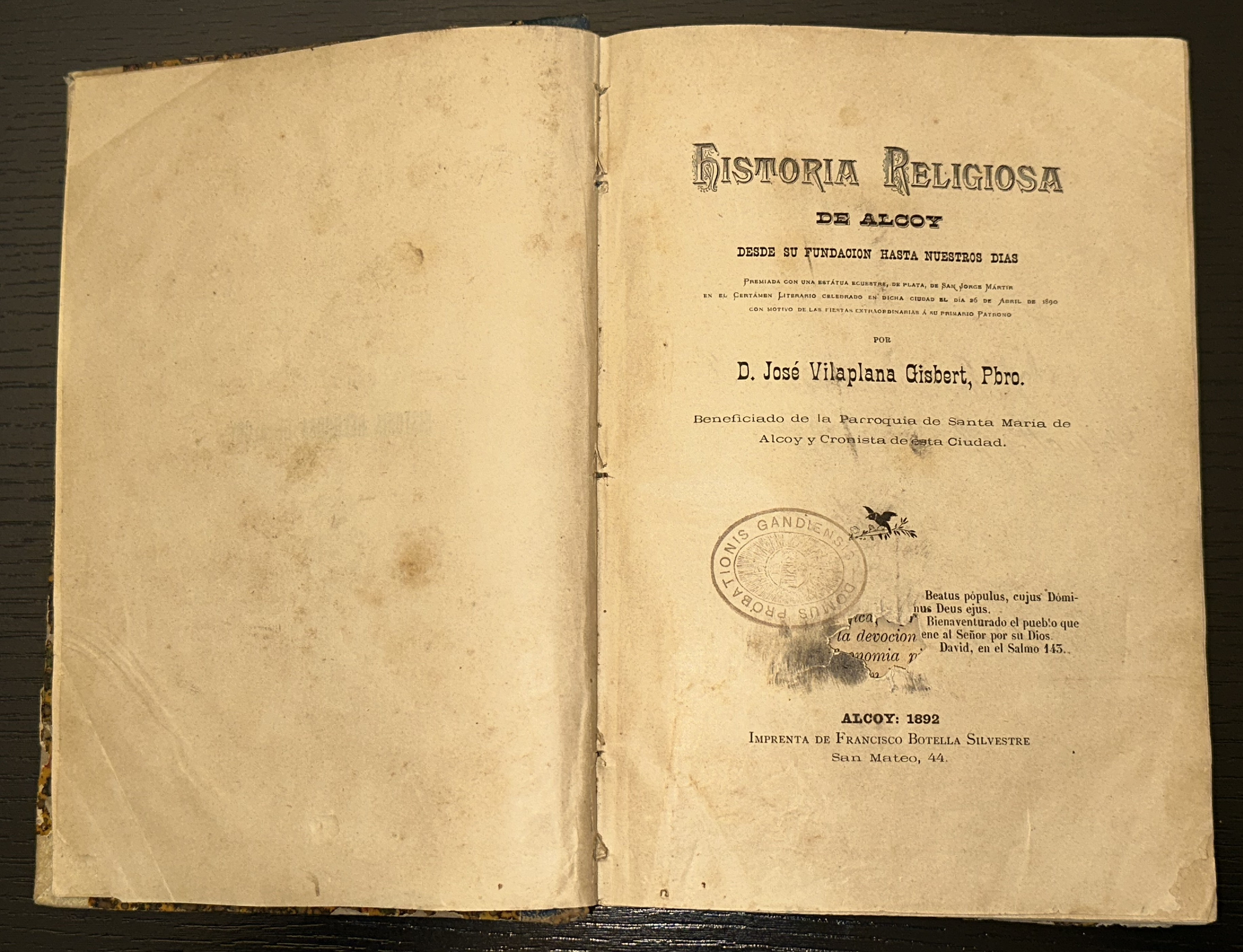 La Biblioteca Municipal d’Alcoi ha rebut una donació d’un exemplar de l’edició original de la «Historia religiosa de Alcoy», obra escrita pel capellà alcoià José Vilaplana Gisbert i editada en la impremta de Francisco Botella Silvestre, l’any 1892. Ha sigut Neus Ferrer Arnau qui ha fet entrega d’aquesta obra que va ser premiada abans de la seua publicació, al Certamen Literari del 26 d’abril de 1890.