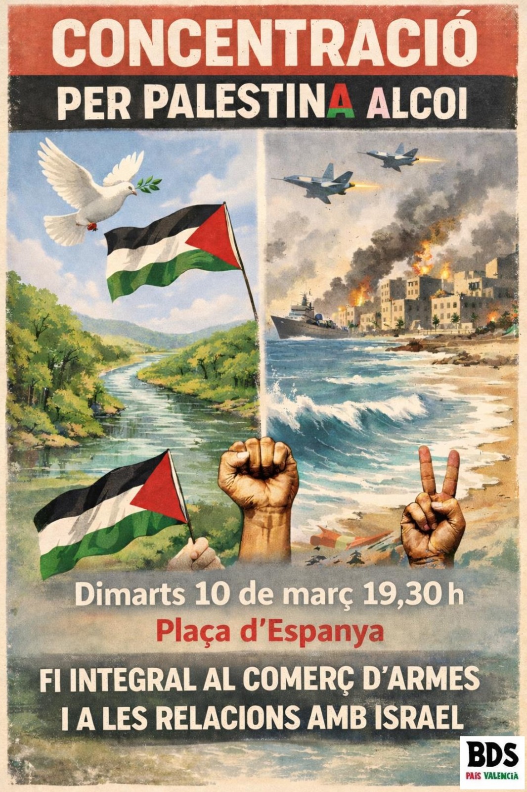 Alcoi acull demà, dimarts 10 de març a les 19.30 hores, una nova concentració en suport al poble palestí. La convocatòria tindrà lloc a la plaça d’Espanya, on els assistents expressaran públicament el seu rebuig a la situació que es viu a Palestina i mostraran la seua solidaritat amb les víctimes del conflicte que, a hores d'ara, continua.