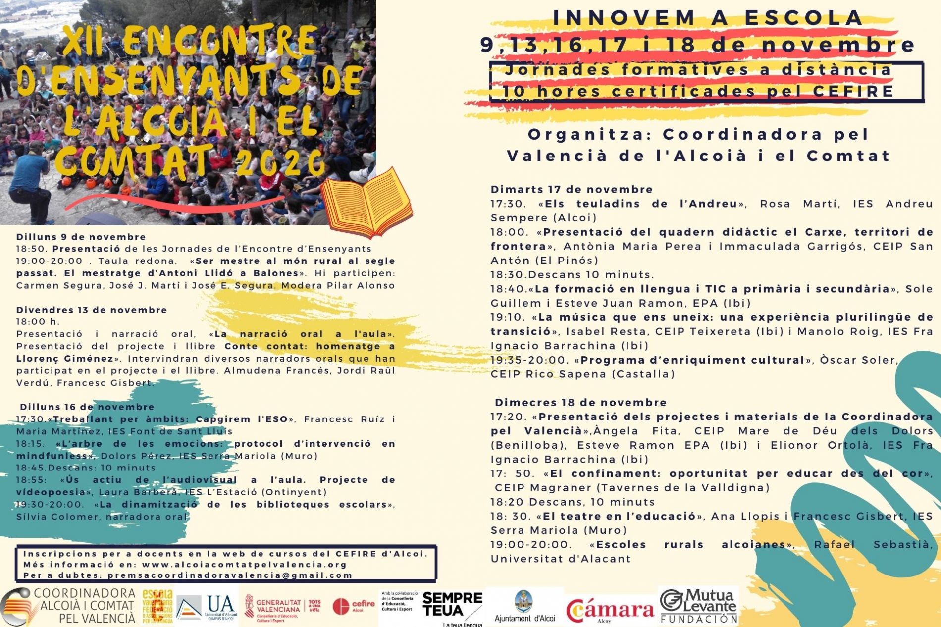 En aquest enllaç es pot formalitzar la inscripció per a les XII Jornades Formatives Encontre d'Ensenyants. Aquestes estan organitzades per la Coordinadora pel Valencià i el CEFIRE Alcoi. Un dels objectius és conèixer alguns recursos per fomentar l'aprenentatge innovador, inclusiu i cooperatiu en tots els nivells educatius. A més també s'adquiriran noves estratègies metodològiques per a treballar per àmbits, a distància i amb les noves tecnologies.