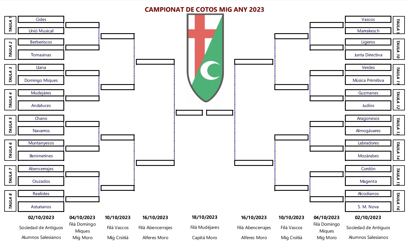 Les activitats del Mig Any s'inicien l'1 d'octubre amb el Concurs de Pintura a l'aire lliure, i la primera partida del Campionat de Cotos el 2 d'octubre. I una altra novetat important és que s'avança la presentació de Càrrecs i el posterior sopar-assaig, que tindrà lloc el 14 d'octubre.