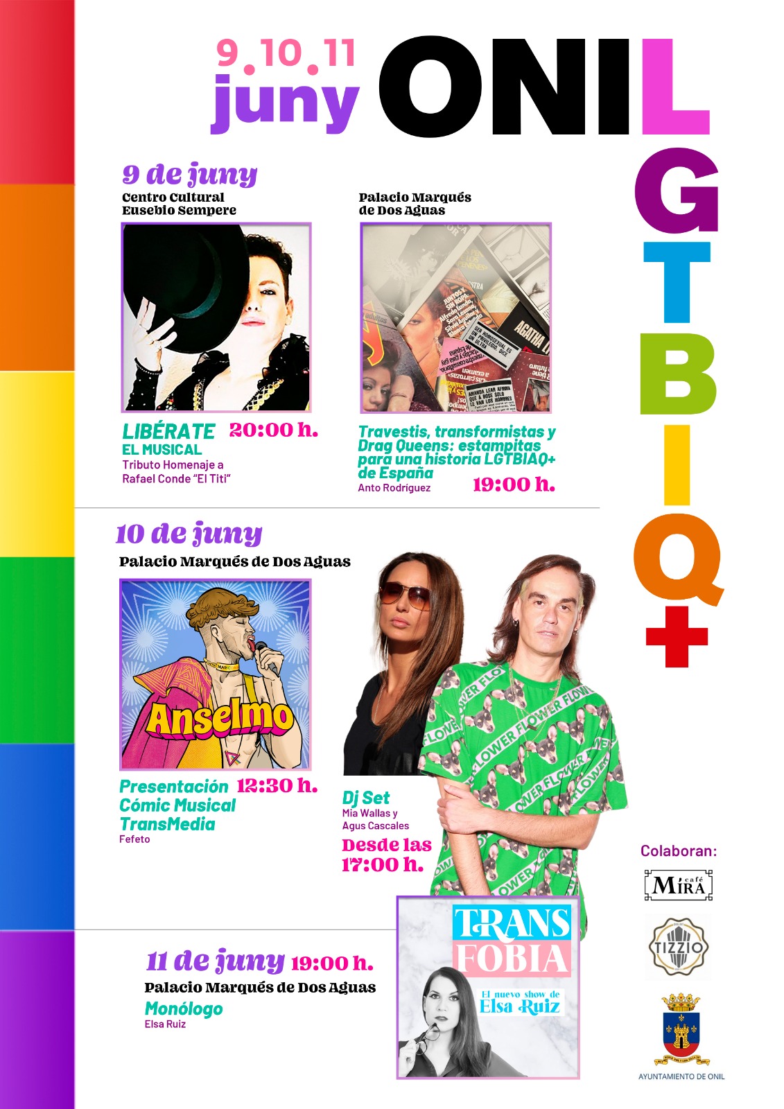 Per acabar, el diumenge 11 de juny a les 19 hores, es posarà punt final als actes que ha organitzat l’Ajuntament d’Onil per a commemorar l’orgull LGTBIQ+ amb el nou show d’Elsa Ruiz “Transfòbia”, que també tindrà lloc al Palau.