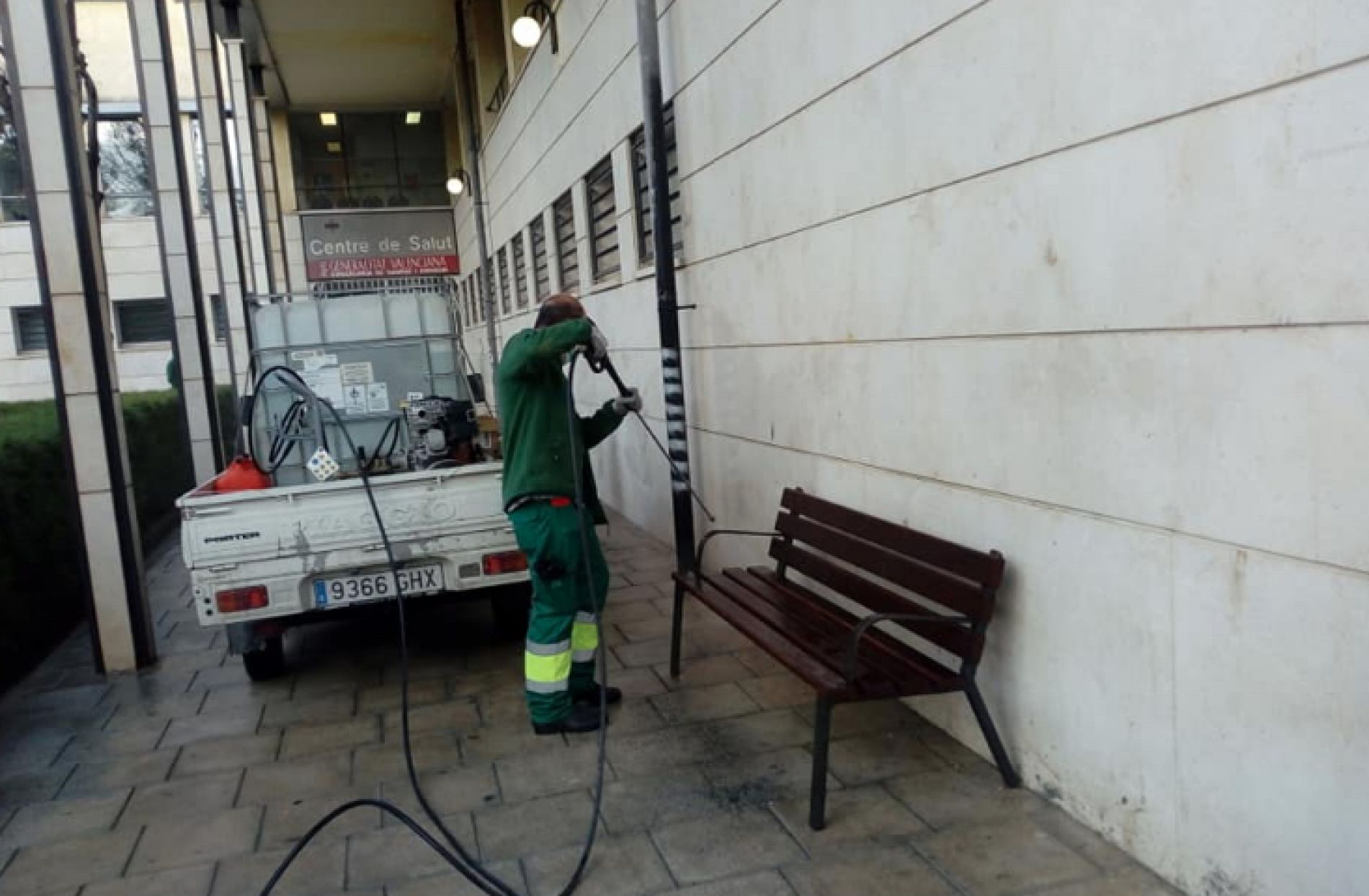 Equipats amb llances d'aigua a pressió, el personal ha començat actuant en aquelles zones per on el trànsit de persones és major durant aquests dies. Entre altres espais públic, s'incideix en àrees com ara el centre de salut i els accessos als establiments comercials d'alimentació.