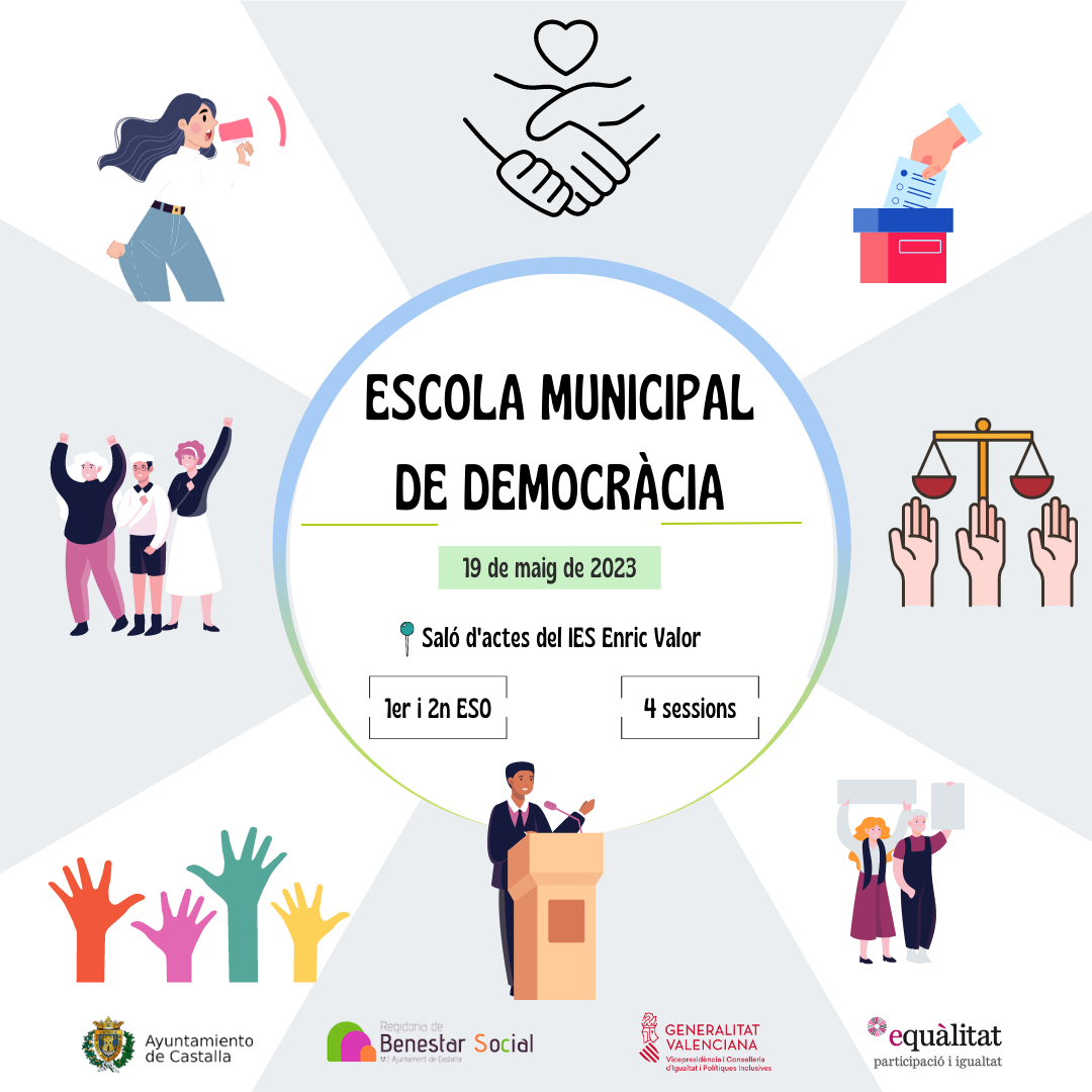 L'Escola Municipal de Democràcia està subvencionada per la Conselleria d'Igualtat i Polítiques Inclusives, i dinamitzada per la consultoria social EQUÀLITAT, des d'on expliquen que "la democràcia és una forma d’organització social i política que atribueix la titularitat del poder al conjunt de la ciutadania. Així mateix, la democràcia és un tipus d’organització de l’Estat en el qual les decisions col·lectives són adoptades pel poble mitjançant mecanismes de participació directa o indirecta. Per tant, és vital que els ciutadans/es estiguen conscienciades dels diferents sistemes polítics".