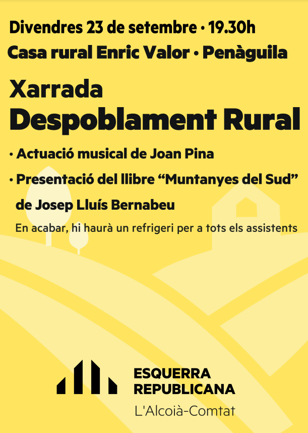 Esquerra Republicana ha organitzat a la casa rural Enric Valor i per al pròxim 23 de setembre a les 19:30h una xerrada sobre despoblament, en ella hi haurà una presentació d’un llibre i una actuació musical.