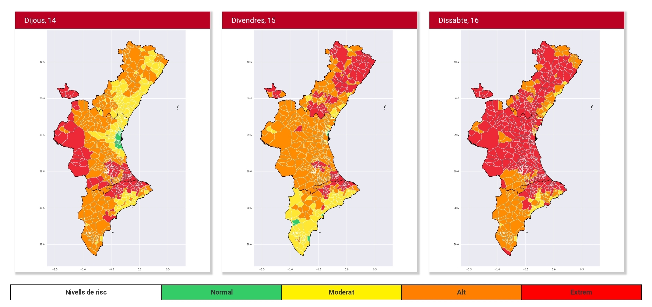 A les nostres comarques, sobretot al Comtat, el risc extrem per altes temperatures continuarà demà i s'incrementarà dissabte 16, com es pot vore en els mapes de previsió del Sistema de Vigilància d'Altes Temperatures de la Comunitat Valenciana.