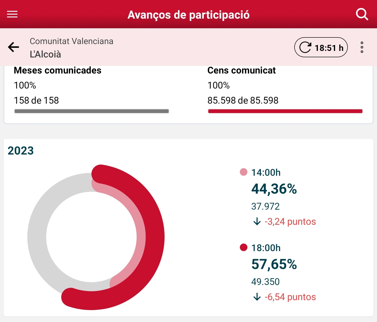 20:15 On més s'ha reduït la participació, segons els avanços de participació i amb dades de les 18 hores, ha sigut a Alcoi. S'ha passat del 56,48 % en 2019, al 43,87 % enguany. Recordem que són dades de les 18 hores, i les finals poden canviar. En 2019 l'abstenció a Alcoi va ser del 36 %.