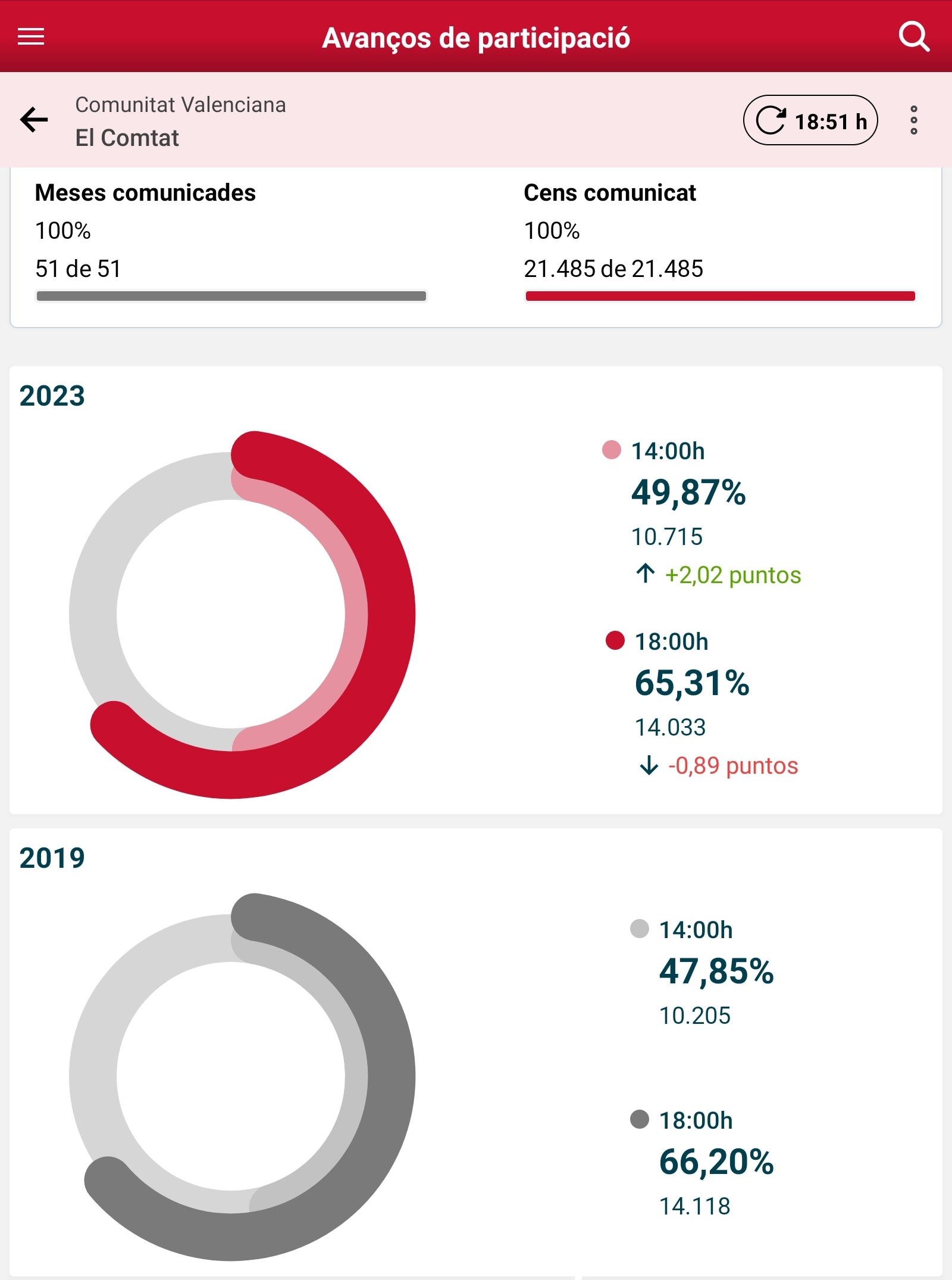19:55 Els col·legis electorals estan a punt de tancar. La participació a les 18 hores a les nostres comarques és del 57,65 % a l'Alcoià, i del 65,31 % al Comtat. Al Comtatg no es nota quasi la reducció de la participació, però a l'Alcoià l'abaixada és de més de 6 punts.