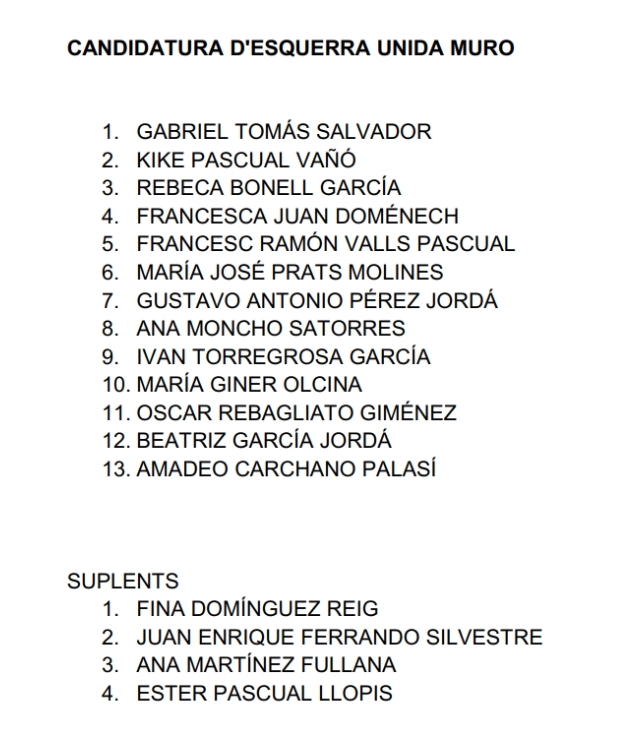 Finalment Esquerra Unida Muro sí que es presenta a les eleccions municipals, i amb la candidatura que es va presentar al públic el passat 12 d'abril. Així ho vol aclarir el partit, després que els últims dies hi haja hagut confusió perquè la llista d'EU Muro apareixia com 'no proclamada' en els llistats oficials.
