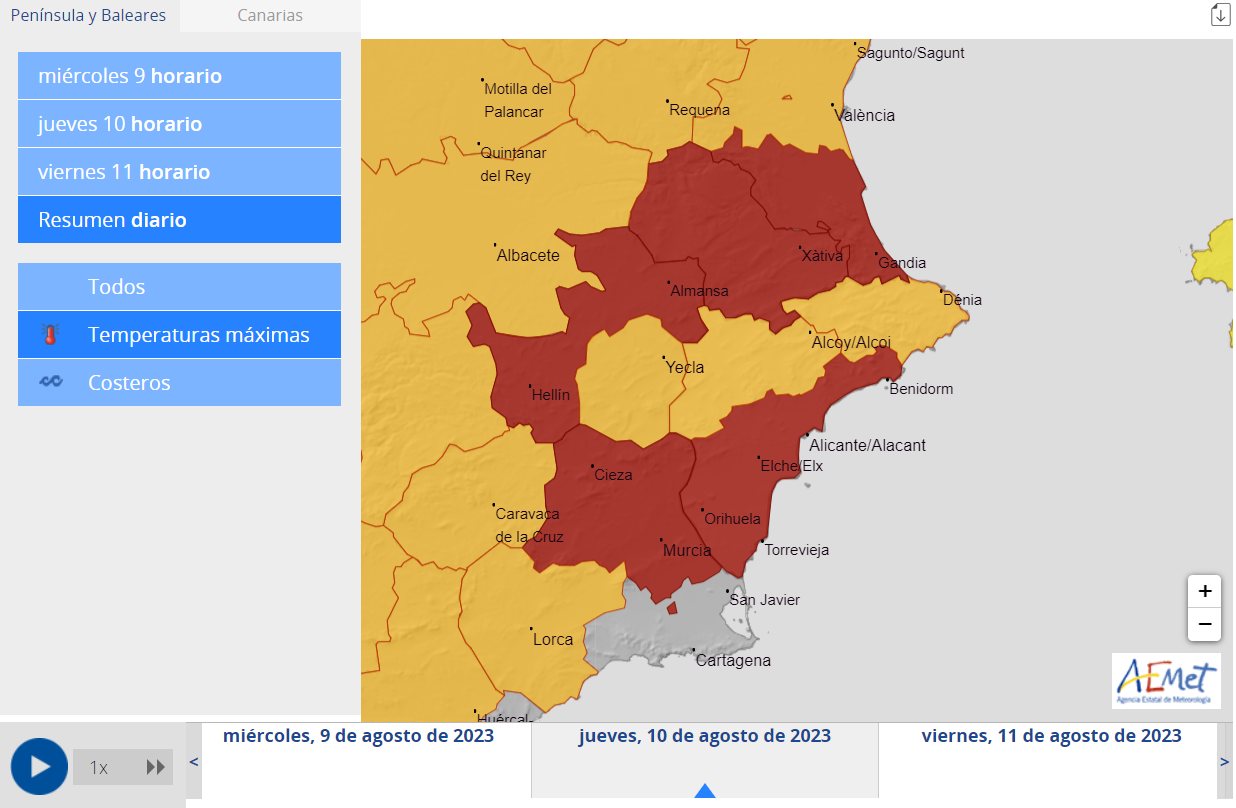 I és que AEMET ha activat l’avís roig al sud del litoral d’Alacant, entorn de Villena i el Comtat, per temperatures que podrien arribar a 44 graus en algunes localitats. La calitja i la possibilitat de tempestes, així com esclafits i activitat elèctrica ha elevat el risc d’incendi a extrem.
