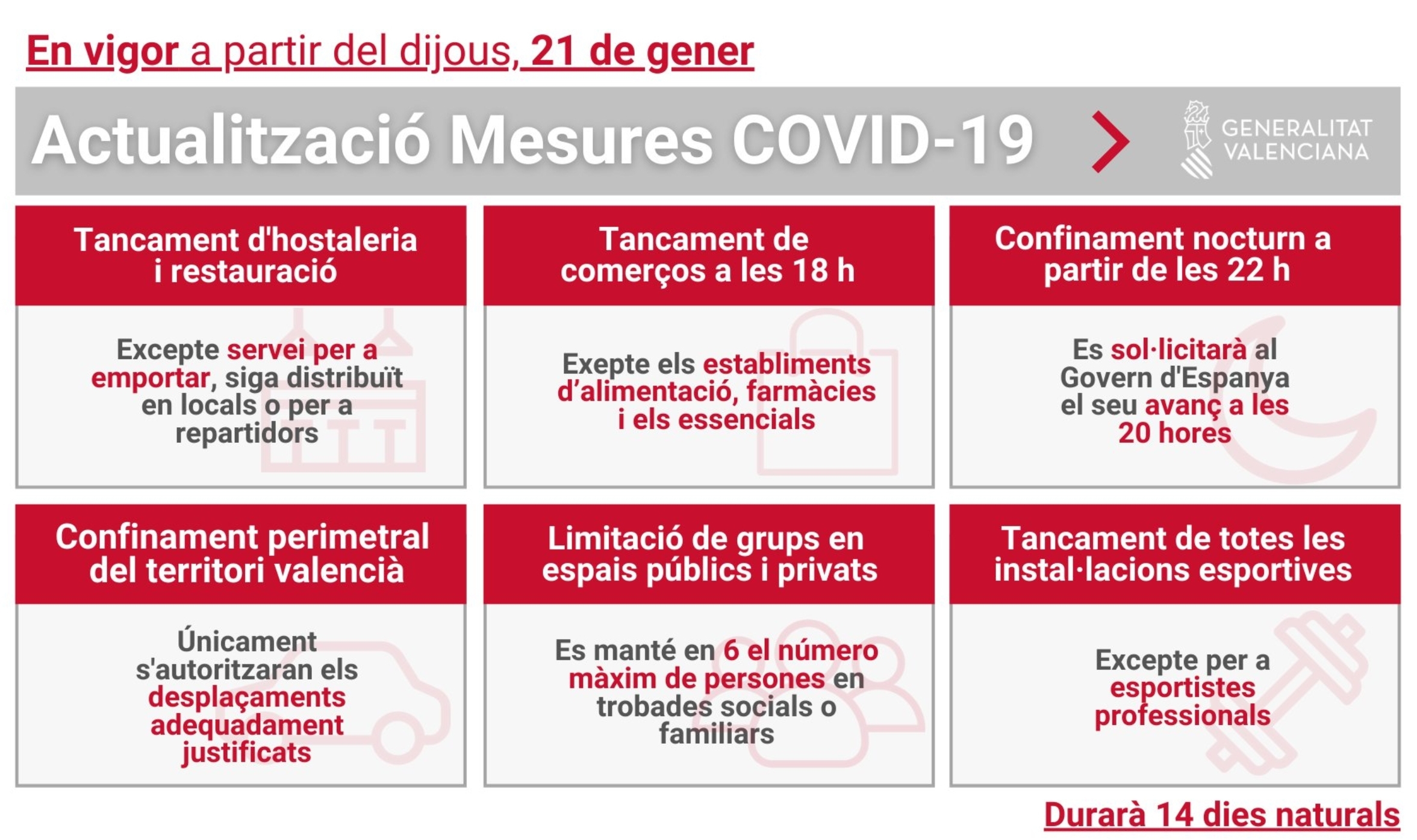 La Generalitat ha anunciat per xarxes socials noves mesures restrictives a tota la Comunitat Valenciana, i que s'aplicaran a partir del 21 de gener i durant 14 dies. Són mesures similars a les que ja s'aplicaven als municipis amb confinament perimetral, com Alcoi, Xàtiva i Ontinyent, on ja estan tancades les instal·lacions esportives o els bars i restaurants. Però s'incorpora una novetat, el tancament dels comerços a les 18 hores.