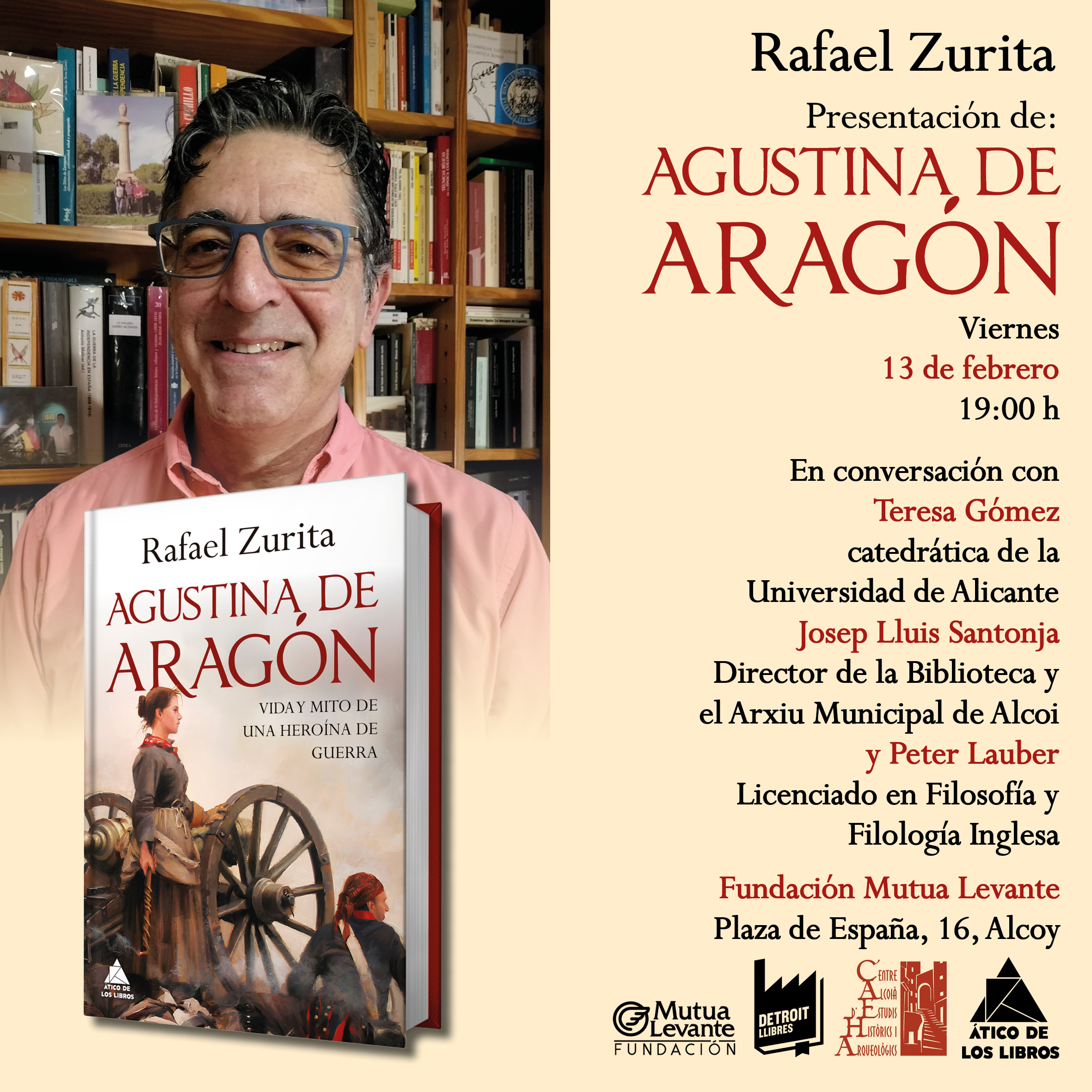 La Fundació Mutua Levante acull la presentació del llibre ‘Agustina de Aragón’ del autor Rafael Zurita. L’esdeveniment té lloc aquest 13 de febrer a les 19h i a l’acte participacian a més de l’autor, Teresa Gómez, Catedrática de la Universidad de Alicante, Josep Lluis Santonja, director de la Biblioteca i Arxiu Municipl d’Alcoi i Peter Lauber, llicenciat en Filosofia i filologia anglesa. Tots mantindran junts una conversa envers la figura protagonista de l’obra.