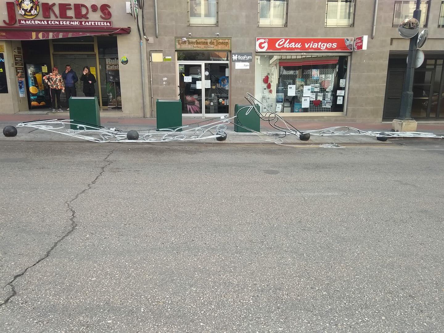 Una enramada de Nadal al carrer El Camí ha caigut, i els Bombers han eixit a Cocentaina per assegurar un fanal que estava a punt de caure. Són dos dels pocs incidents provocats pel fort vent.