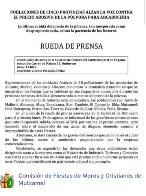 Una cinquantena de poblacions de la Comunitat Valenciana, Múrcia i Castella-La Manxa, han alçat la veu per protestar pel que consideren una situació dramàtica que està afectant un acte patrimonial de les Festes de Moros i Cristians com els alardos. Protesten pel preu de la pólvora i demanen solucions perquè no torne a passar el d'enguany; que moltes festivitats s'han quedat sense arcabusseria.