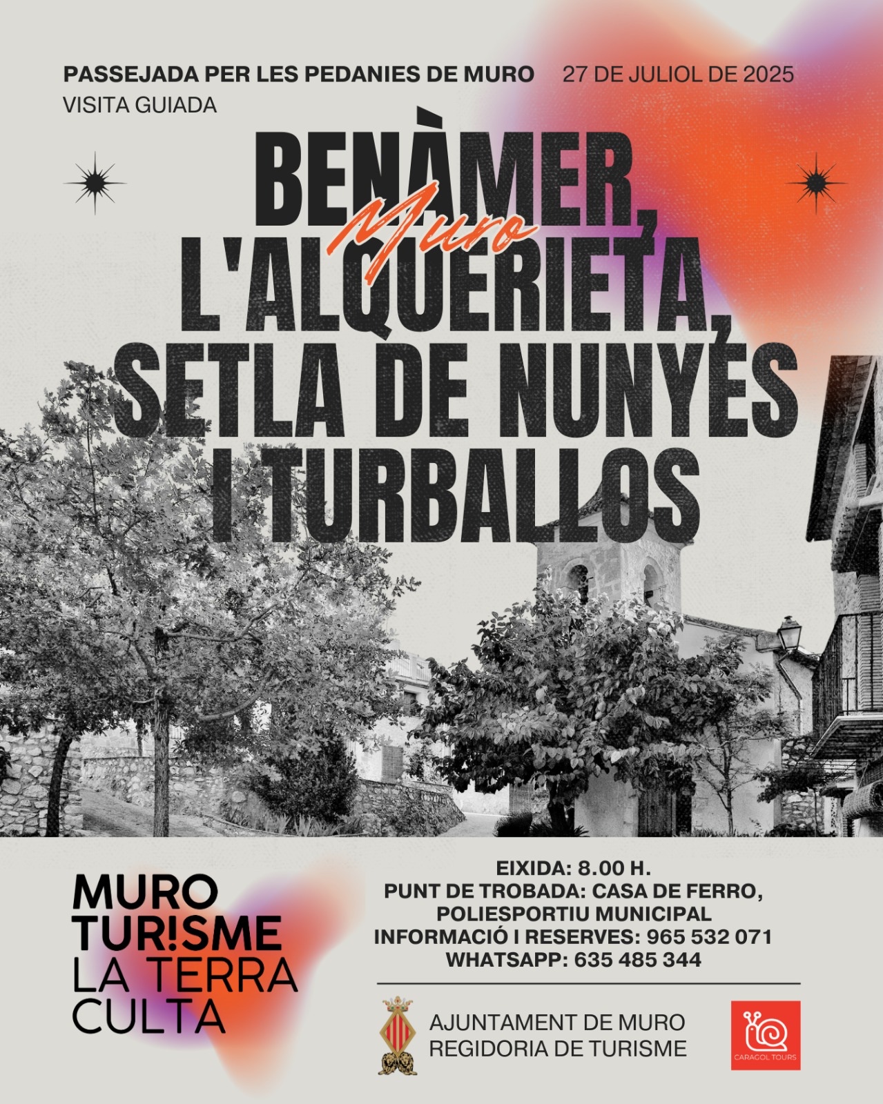 La Regidoria de Turisme de Muro convida veïns i visitants a participar aquest diumenge 27 de juliol en una passejada guiada per les pedanies de Benàmer, l’Alquerieta, Setla de Nunyès i Turballos, amb l’objectiu de reivindicar la memòria local i l’encant natural del municipi. L’activitat comença a les 8 del matí des de la Casa de Ferro, al costat del Poliesportiu Municipal, i compta amb les explicacions d’un guia especialitzat en patrimoni.