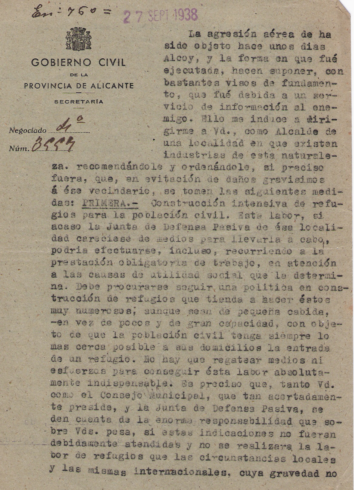Alacant ja havia patit els atacs d’aviació amb bombes i el govern civil era conscient del problema. És per això que l’alcalde de Cocentaina rep una carta (1 i 2) indicant-li (u ordenant-li si fos necessari) dos importants punts: que prenga les mesures adequades referent a la construcció de refugis i que vagen alerta en els forasters que entren i ixen del poble. El primer lloc diu que tot indica que la població d’Alcoi ha estat agredida per l’enemic com a conseqüència de les fabriques de material de guerra i que també Cocentaina està en risc de fer-ho per tindre una fàbrica d’aquest material. També diu que no té cap dubte que els atacs d’Alcoi ha sigut per algú que s’ha infiltrat amb carnet del Front Popular i ha informat l’enemic.