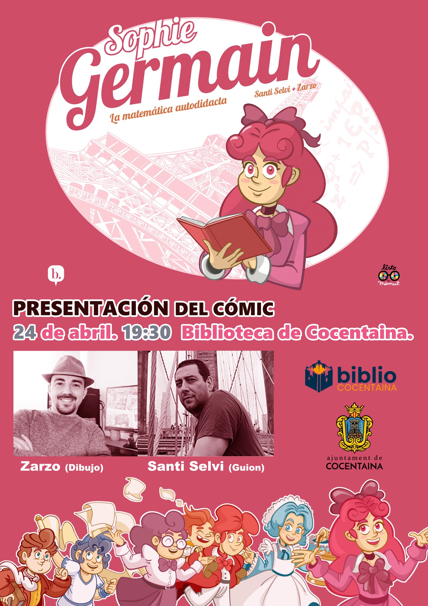 A més, com a activitats paral·leles, s’ha organitzat la presentació del còmic «Sophie Germain, la matemàtica autodidacta» el dijous 24 d’abril a les 19:30, la Biblioteca Municipal, a càrrec de Santi Selvi (guió) i Zarzo (dibuix); una animació lectora el divendres 25 d’abril a les 17:30 a l’Ocellet de Colors, així com la inauguració de l’exposició «Imatgeria. Art a la biblio» a les 19:30 en la Biblioteca; i, finalment, el dimarts 29 d’abril, podrem gaudir d’un contacontes a la Papereria del Ferrocarril a les 17:30.