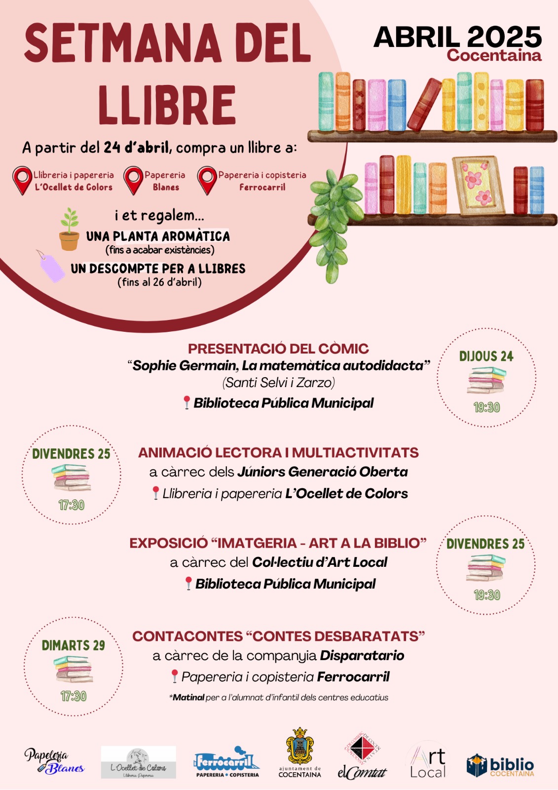 Ja ha passat Sant Jordi (23 d’abril), però la passió pels llibres continua a Cocentaina gràcies a la Setmana del Llibre. Entre el 24 i el 26 d’abril, si adquireixes un llibre en la Llibreria i Papereria l’Ocellet de Colors, la Papereria Blanes o la Papereria i Copisteria el Ferrocarril, rebràs una planta aromàtica i descomptes en les teues compres.
