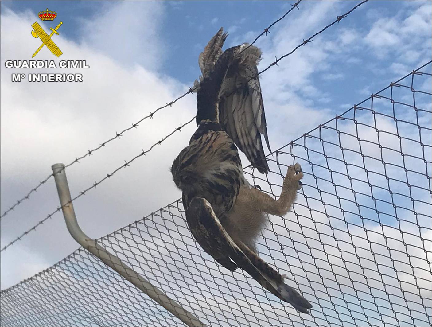 Una patrulla de la Guàrdia Civil ha salvat la vida d'un mussol reial després que una de les ales d'aquest quedara immobilitzada en una tanca de filferro. El rescat ha tingut lloc en Mutxamel, a càrrec d'una partida del SEPRONA de la veïna localitat de Xixona.