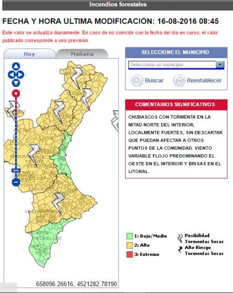 La possibilitat de tempesta elèctrica posa més en alerta a les nostres comarques per incendi forestal per a hui, 16 d'agost. El cel ha clarejat encapotat i el vent anirà en direcció oest a l'interior, segons informa el Servei d'emergències de la Generalitat Valenciana.
