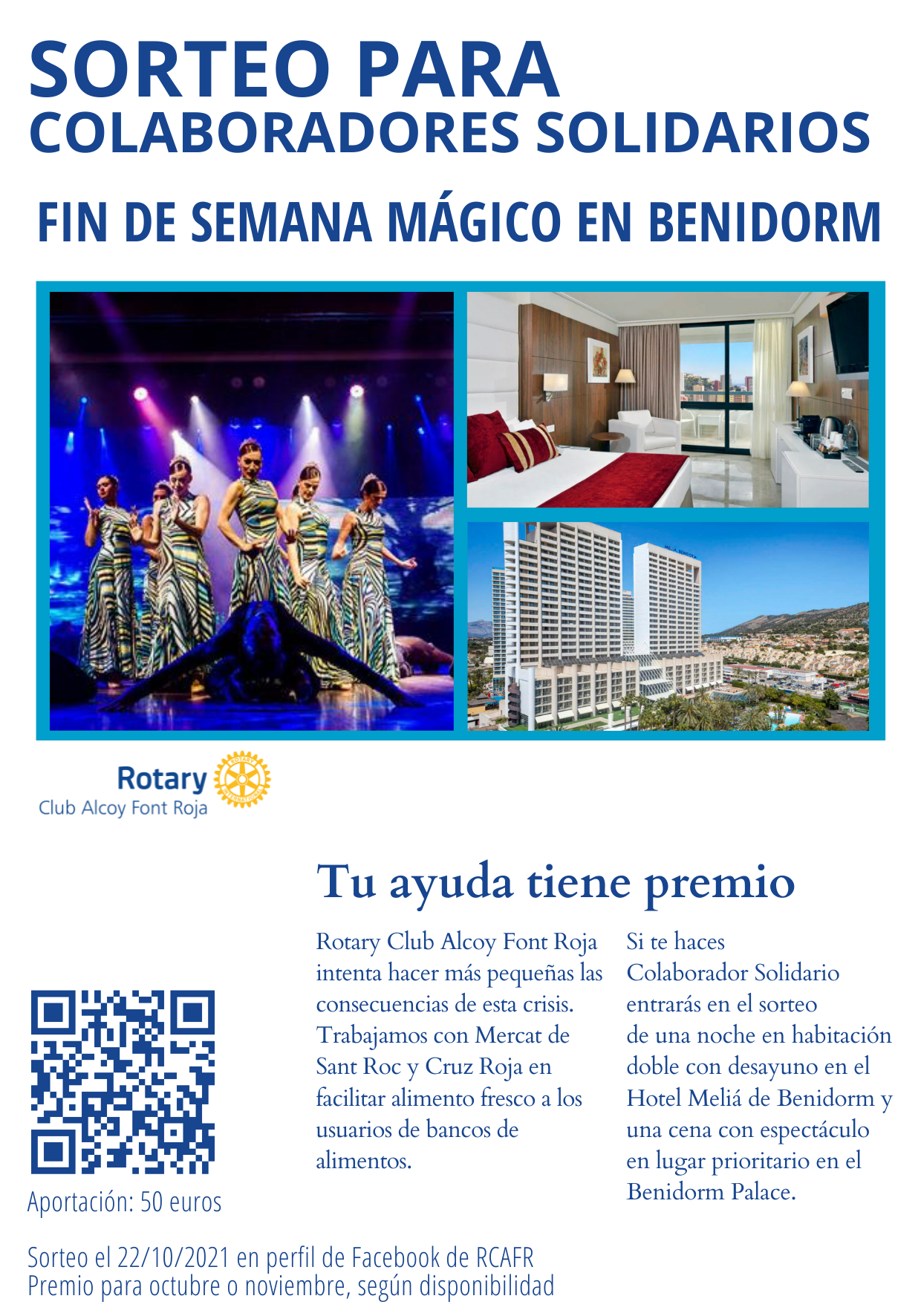 El col·laborador solidari aporta 50€ destinats a projectes solidaris. L’entitat sorteja entre els participant un cap de setmana per a dos persones en l’Hotel Melià de Benidorm amb un sopar espectacle al Benidorm Palace