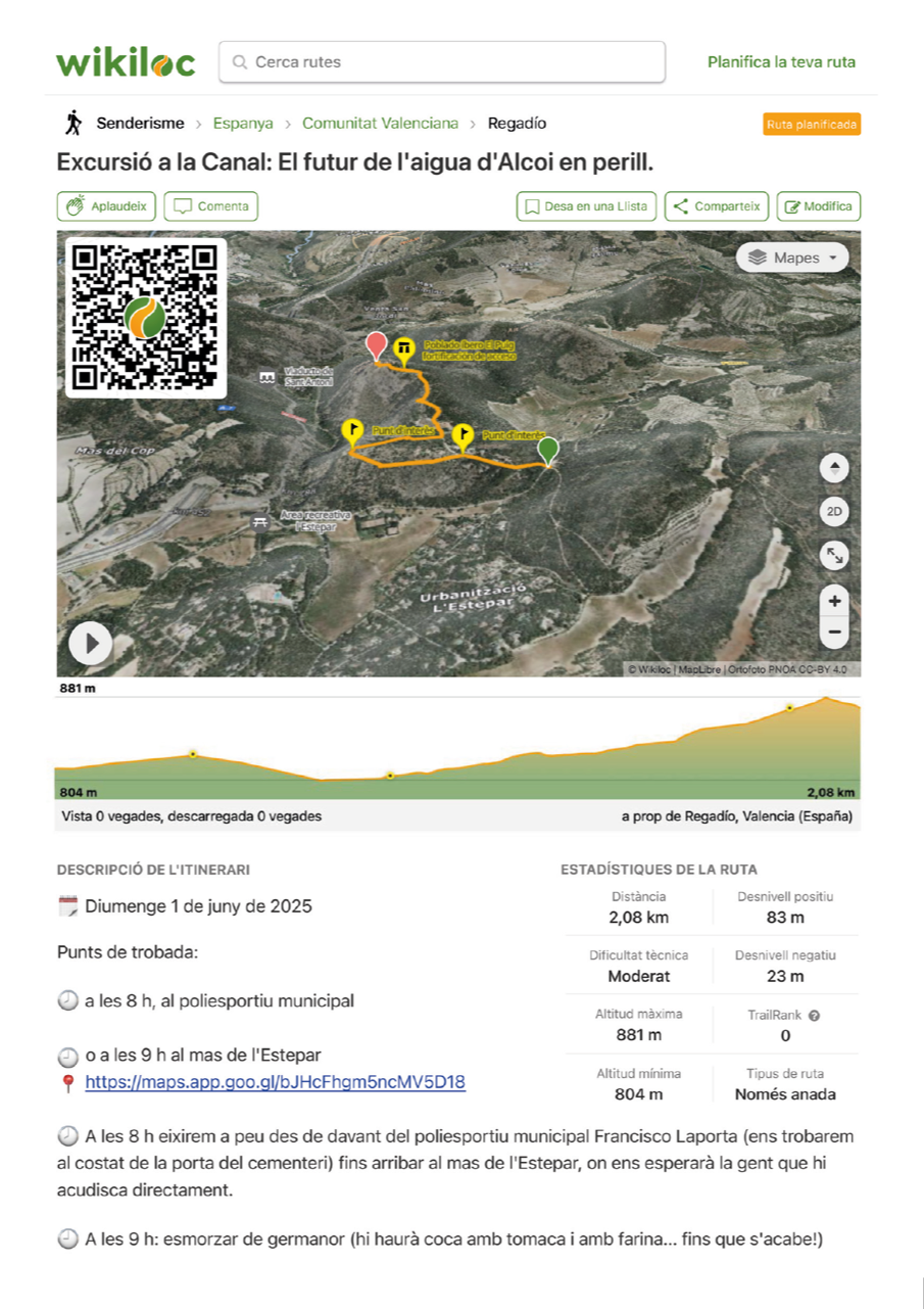 Es recorrerà les zones on es vol implantar el polígon Alcoi Sud i ampliar la urbanització de l'Estepar, fins al cim del Puig. Serà este diumenge 1 de juny, sota el nom 'El futur de l'aigua d'Alcoi en perill'.