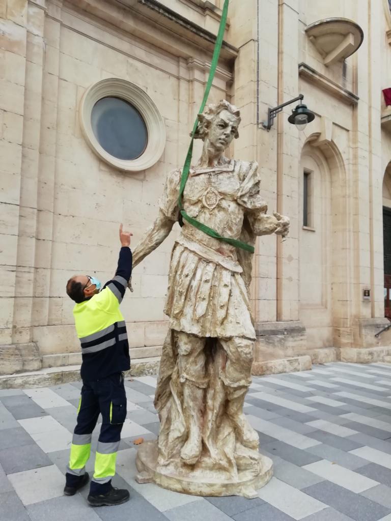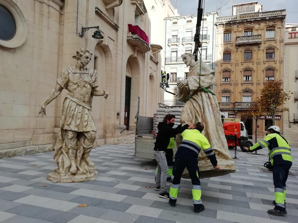 Un conveni entre l’Ajuntament d’Alcoi i l’Associació de la Parròquia de Sant Maure ha permés la creació de dos estàtues que ara presideixen la façana de l’església de Sant Maure a la Plaça Ramón i Cajal.