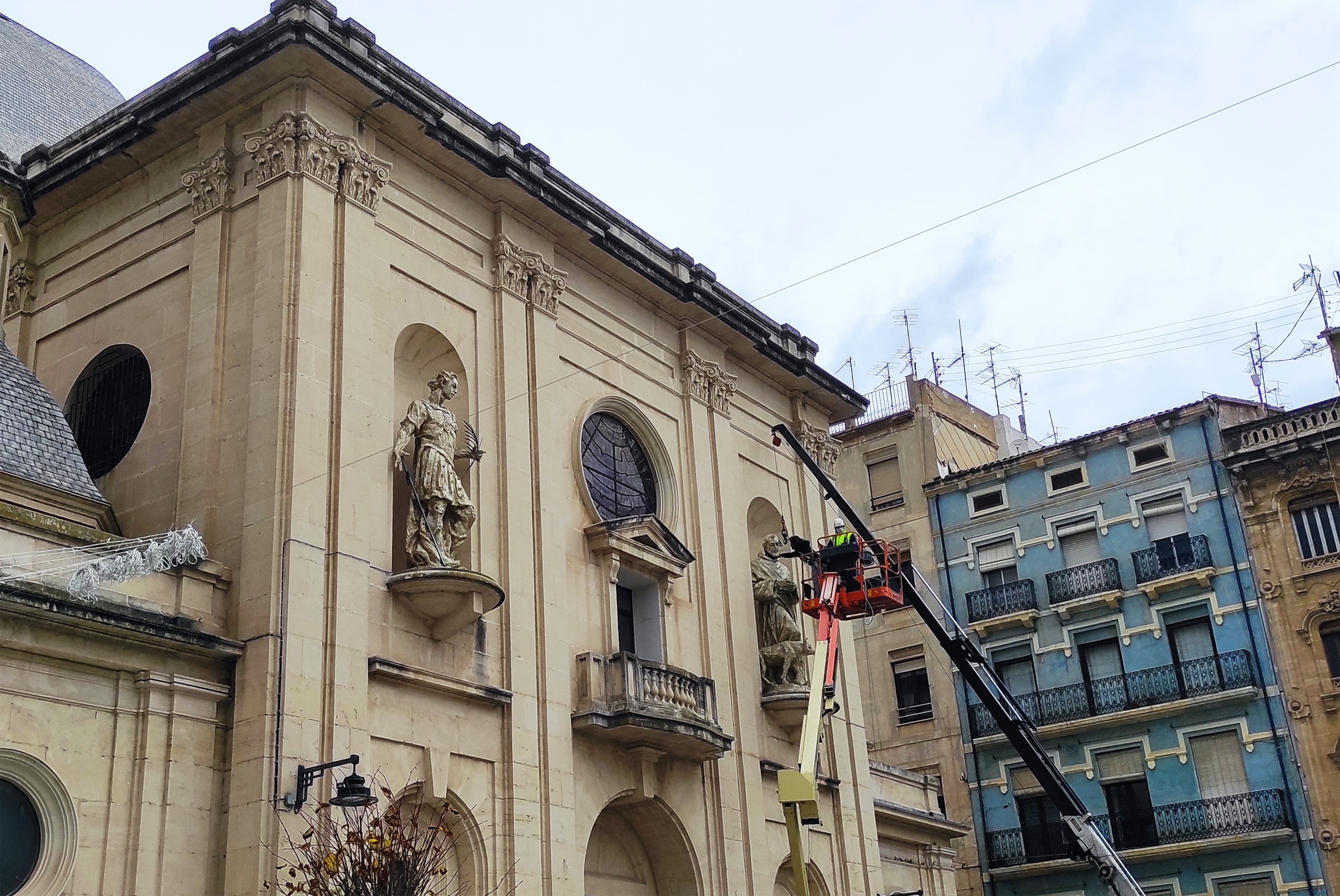 Aquest matí, 4 de desembre, ha sigut un anar i vindre de treballadors de l’administració i de curiosos, entre ells Aramultimèdia, a la Plaça de Ramón i Cajal perquè han estat col·locant les imatges de Sant Francesc i de Sant Maure en la façana de l’església.