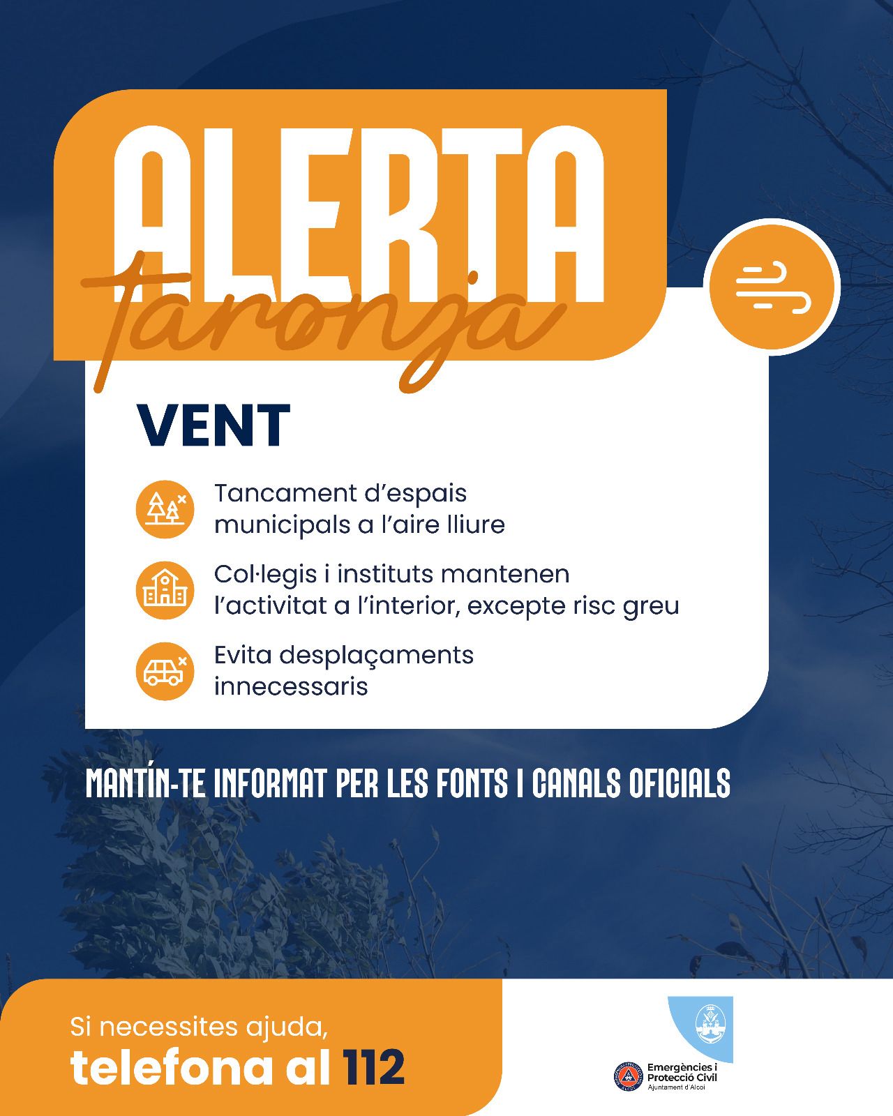 Davant les fortes ratxes de vent que s'esperen a Alcoi, i amb l'alerta taronja decretada pel Centre de Coordinació d'Emergències, l'Ajuntament d'Alcoi ha pres diferents mesures preventives i avisa a la població.