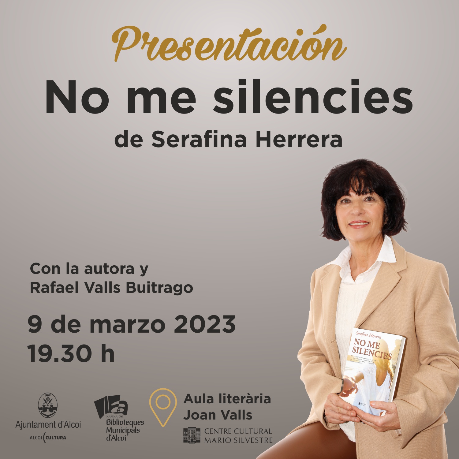 L’alcoiana Serafina Herrera presenta aquest 9 de març a les 19’30h a la Casa de la Cultura d’Alcoi el seu nou llibre ‘No me silencies’, una narració que pretén ser un retrat generacional entre la sensualitat i la identitat en les que es debat la dona contemporània.