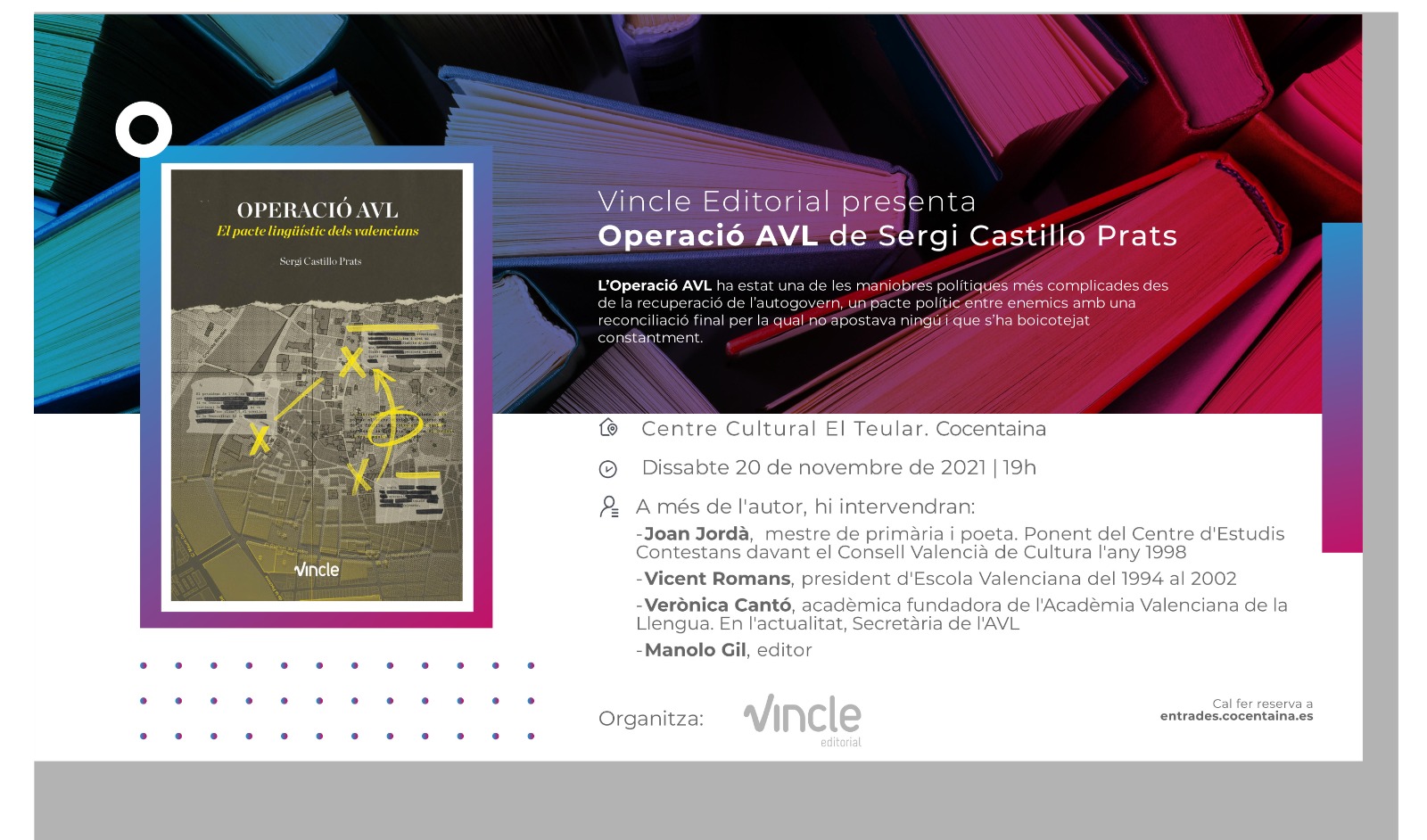 Sergi Castillo presenta el pròxim dissabte 20 de novembre a les 19h al Centre Cultura El Teular de Cocentaina el seu últim treball d’investigació titulat ‘Operació AVL. El pacte lingüístic del valencians’. Aborda en el llibre els secrets al voltant del pacte lingüístic orquestrat per Eduardo Zaplana i Jordi Pujol entre els anys 1996 i 2002 que va donar com a fruit l’Acadèmia Valenciana de la Llengua.