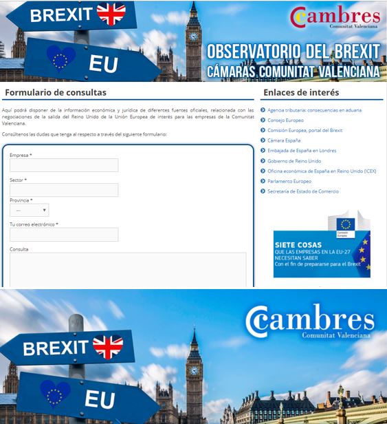 Les cinc cambres de comerç de la Comunitat Valenciana han habilitat un portal per atendre les consultes de tots els empresaris respecte al Brexit i les seues possibles conseqüències. Es pot accedir per la web de la Cambra de Comerç d'Alcoi, que compta amb un accés directe al portal.