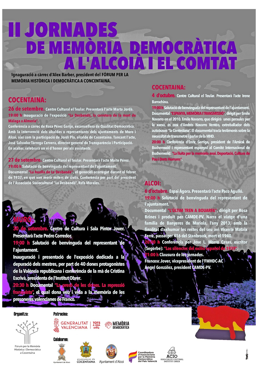 Les jornades continuaran en Cocentaina, Alcoi i Muro fins al 6 d’octubre amb diversos actes que inclouran conferències, documentals, exposicions i testimonis directes amb l’objectiu de donar llum a una època obscura de la nostra història recent amb veus expertes com les de Maite Pérez, Pedro Corredor, Cristiana Escrivà o José L. Morro.