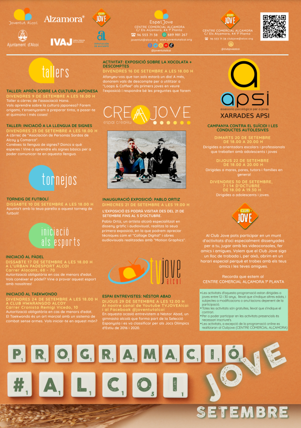 Tornen les activitats destinades a la joventut dins de la programació que prepara la regidoria. Aquest mes de setembre ve carregar de tallers, xerrades, exposicions i activitats esportives, entre d’altres. Recordem que l'Edifici Cervantes acull unes obres de Rehabilitació i eficiència energètica cofinançades per Fons Europeus i Generalitat. Per aquest motiu des del dilluns 18 de juliol, la regidoria de Joventut va establir les seues dependències en la primera planta del CC Alzamora, on utilitza tres locals tant per a les oficines com per a la resta de les activitats.