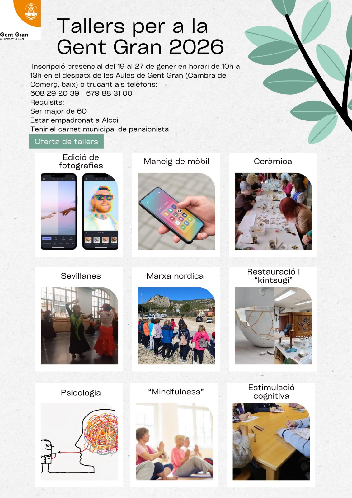 La regidoria de Gent Gran de l'Ajuntament d'Alcoi ha donat a conéixer l'oferta de tallers per a este 2026 i que abasten temàtiques molt diverses. Tenim tallers de tecnologia, com un per a entendre el telèfon mòbil o altre d'edició de fotografies. PEl que fa a l'art tenim un taller creatiu amb classes de ceràmica, i un altre per aprendre kintsugi, una tècnica japonesa per a reparar ceràmica amb or. També hi ha oferta esportiva amb marxa nòrdica i sevillanes, i també tallers que busquen millorat el benestar emocional amb psicologia, mindfulness i estimulació cognitiva.