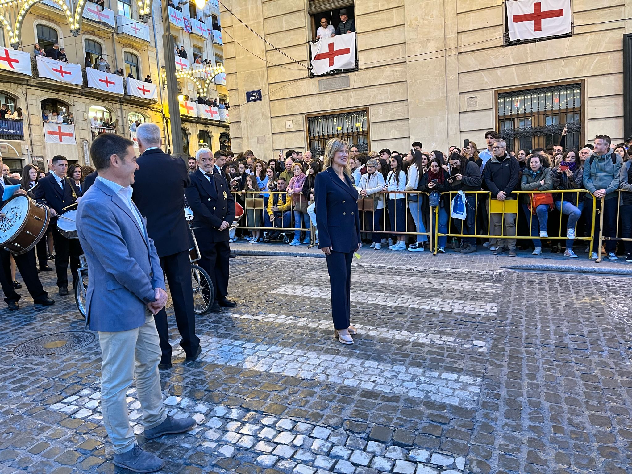 La directora de l'himne ha dirigit a totes les bandes qui han tocat junts les notes acompanyats dels alcoians i alcoianes que han entonat el 'Nostra festa'... en el primer dia de la trilogia festera.