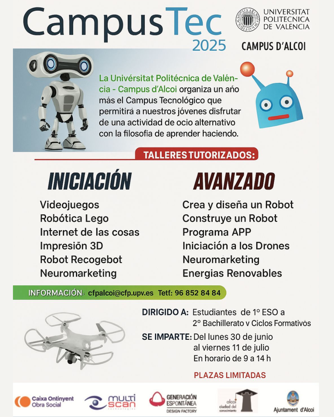 Arriben les vacances d’estiu. Una època molt calorosa, però amb moltes oportunitats per a continuar aprenent. Per aquest motiu, un any més, podrem gaudir del CampusTec del 30 de juny a l’11 de juliol al Campus d’Alcoi de la Universitat Politècnica de València (UPV).