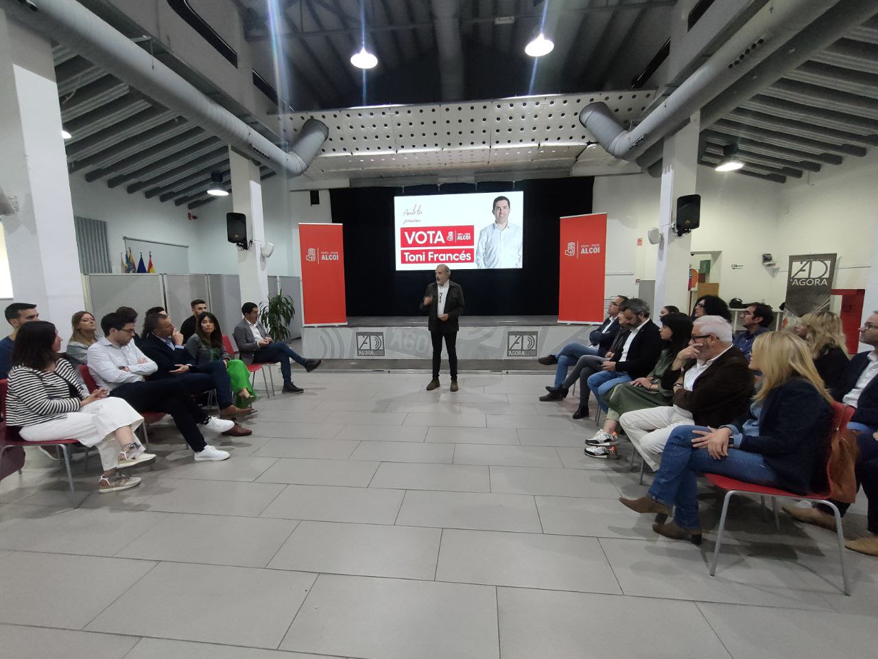 Hores després d'estar apegant els cartells electorals, els socialistes alcoians inicien la campanya electoral amb un acte en l'Àgora amb la presència de quasi tots els membres de la candidatura i on Toni Francés ha fet un primer avanç del seu programa electoral que "hem hagut de resumir en 100 accions".