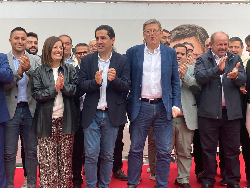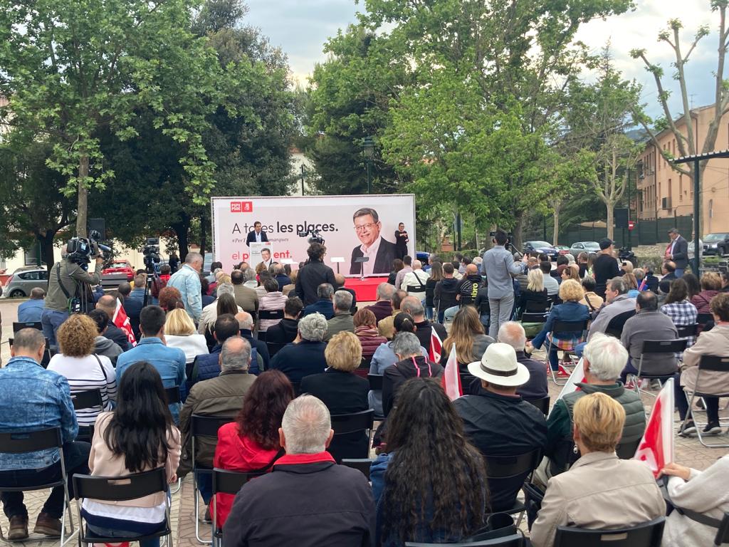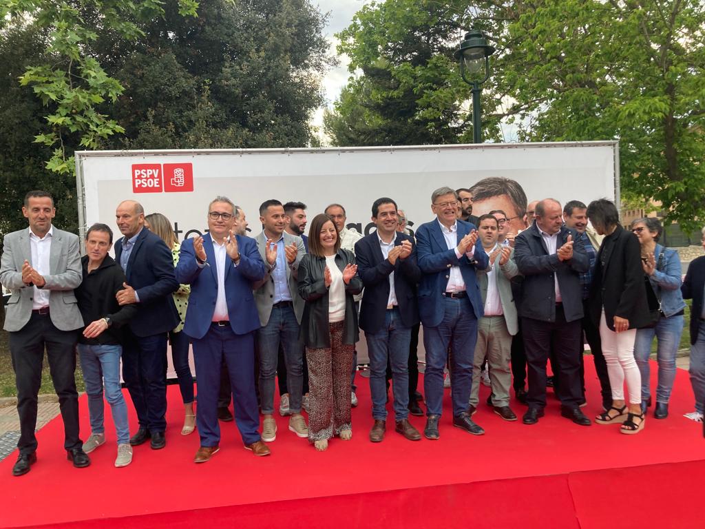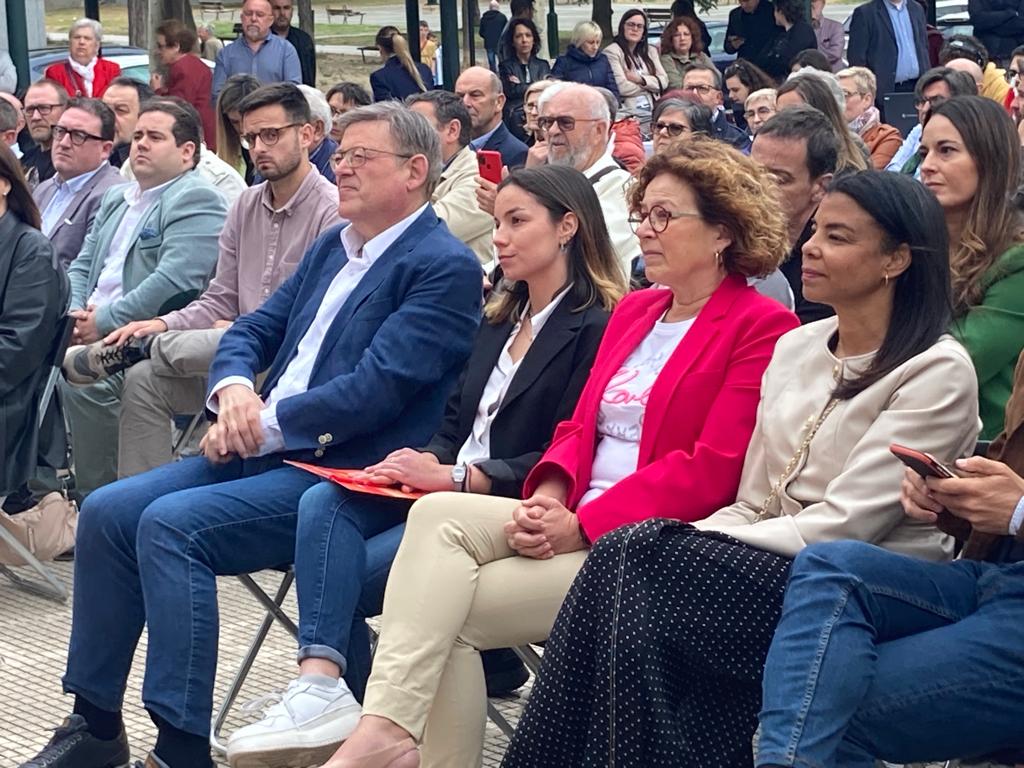 Expectació en la plaça Blas Domingo Llidó de la Zona Nord per a escoltar Ximo Puig i Toni Francés en un míting on el president ha anunciat una inversió de 81 milions d'euros per a modernitzar i ampliar l'Hospital comarcal Mare de Déu dels Lliris.