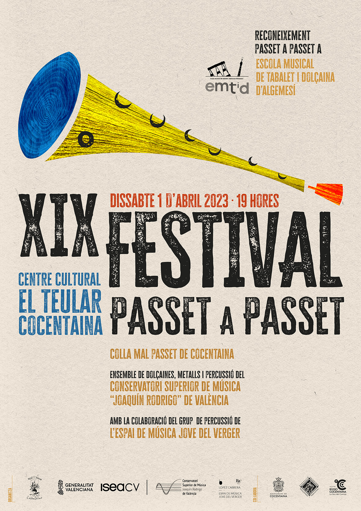 El pròxim dissabte 1 d’abril a les 19h el Centre Cultural El Teular de Cocentaina tindrà lloc la XIX edició del Festival Passet a Passet que organitza anualment la colla contestana de dolçaines i tabals Mal Passet.
