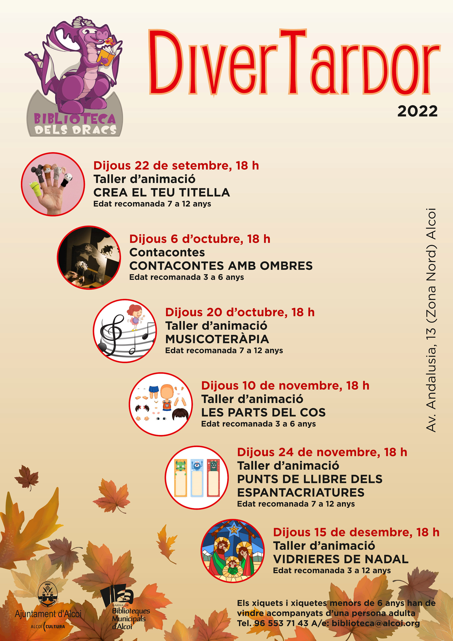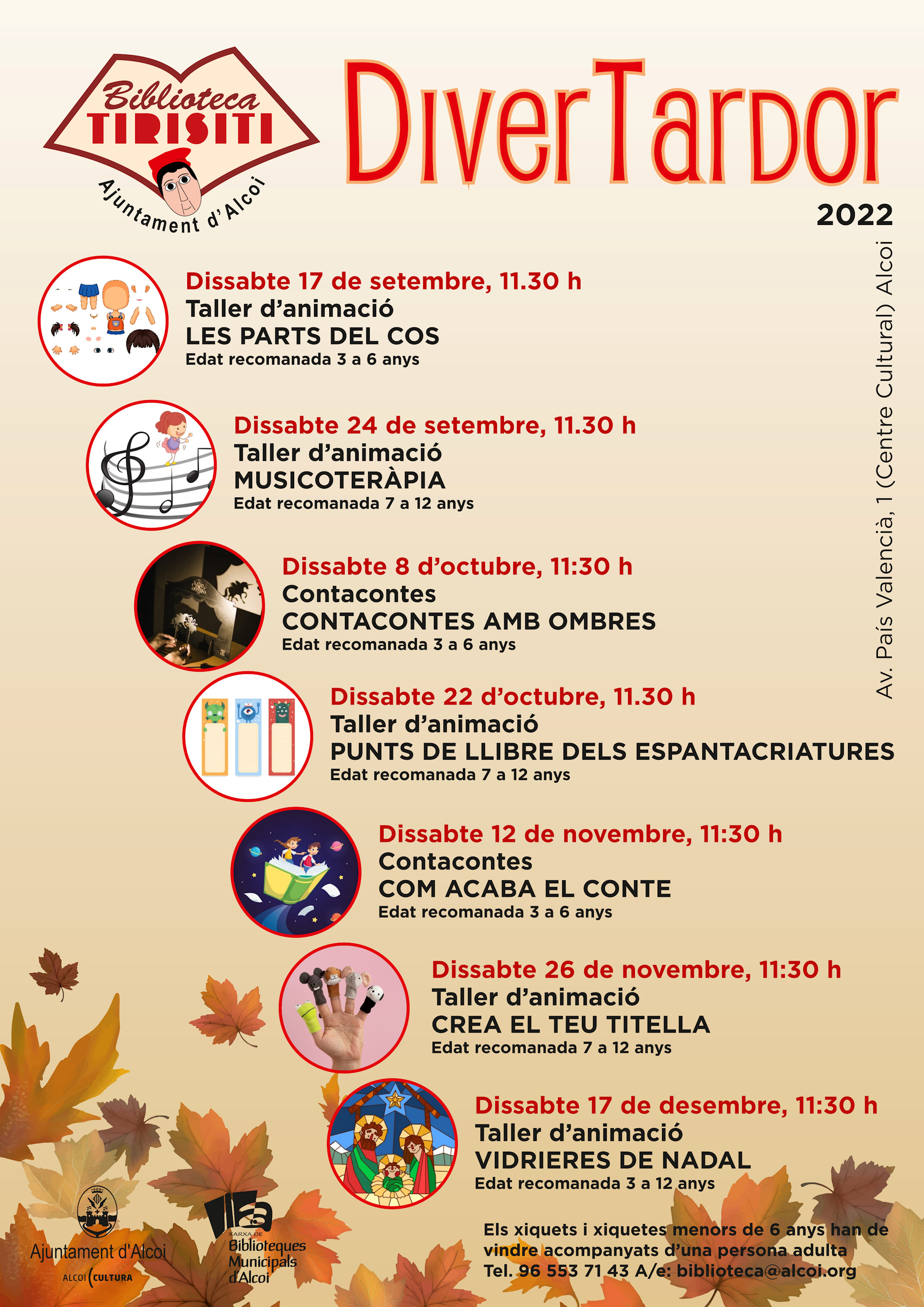 Per inscriure’s als talles o contacontes cal reservar telefonant al 96 553 71 43 o 96 553 71 57 només de vesprada o bé enviant un correu a biblioteca@alcoi.org. Per al contacontes en anglés cal reservar contactant amb Kids&Us Alcoi (telèfons 680109126 i 966291858, o bé al correu alcoi@kidsandus.es).